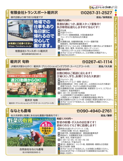 52●●●キャリアチェンジ!異業種からの転職を応援未経験でも大丈夫Re-Challenge(再挑戦)・Re-Start(再出発)正社員大型ドライバードライバー経験者優遇、大型自動車免許フォークリフト免許ある方大歓迎1名交通費支給、各種保険完備、マイカー通勤可能制服貸与、免許取得支援制度あり運行スケジュールによる※実働8時間※運行先により変動あり日曜、祝日、夏季、年末年始、他ローテーション(社内カレンダーによる)※休日出勤は代休ありまずは「ココどう?を見ました」とお気軽にお電話下さい。月給250,000円∼有限会社トランスポート軽井沢有限会社トランスポート軽井沢御代田町御代田2381-5御代田駅より車で約1分程度です担当/採用担当業務好調につき、新規スタッフ募集中!免許取得応援もしますので安心です!月給25万円∼☎0267-31-2527御代田町https://torakaru.co.jp/お気軽にご応募ください。地場での仕事もあり毎日家に帰れるので安心して働けます。野菜の生産スタッフ(パート)3名※野菜の収穫・手入れ・箱詰めなど年齢不問、未経験者歓迎!要普通自動車免許昇給あり、交通費規定支給(1日200円)雇用、労災、作業手当あり9:00∼12:00、13:00∼16:00※午前のみ・午後のみ可週1日∼勤務OK!※シフト制、勤務時期・期間など応相談佐久市岸野・高瀬まずは「ココどう?を見ました」とお気軽にお電話ください。2024年5月下旬∼11月末日までの期間限定のお仕事です。時給1,100円∼ななとも農場合同会社ななとも農場佐久市岩村田2865-3佐久市岸野と高瀬にある当社農園が勤務先です!担当/勝野野菜の収穫・手入れのお仕事です!初めての方でも丁寧に指導します!時給1,100円∼☎090-4940-2761佐久市野菜の収穫収穫お手伝いしてくれませんか?してくれませんか?週日∼1OK!午前のみ午後のみ2024年5月下旬∼11月末日までズッキーニ、ミニトマト、ネギ等を栽培しています!週2日勤務からOK!未経験の方でも仲間がサポートするから安心!アルバイト2名販売スタッフ(レジ・接客・品出し)未経験者歓迎!学生・主婦(夫)、土日祝日入れる方大歓迎!長期できる方、フルタイム希望の方は応相談交通費規定支給、社会保険完備、制服貸与(シャツ、エプロン)社割あり、有給休暇あり9:30∼19:30の間で応相談※上記時間帯で1日5時間から勤務できる方※季節によって変動あり※営業時間は施設に準ずる週2日勤務からOK(シフト制・応相談)希望をお聞かせください。まずは「ココどう?を見ました」とお気軽にお電話ください。時給980円∼軽井沢旬粋軽井沢旬粋軽井沢・プリンスショッピングプラザ・スーベニアコート内https://kk-takachiho.jp/JR軽井沢駅からすぐ!軽井沢・プリンスショッピングプラザ・スーベニアコート内担当/大久保出勤日時はご相談に応じます!主婦(夫)、学生、長期できる方大歓迎!時給980円∼☎0267-41-1114軽井沢