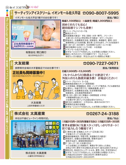 ねっ!ココどう?転職するなら多いほうがいい。oror53●●●キャリアチェンジ!異業種からの転職を応援未経験でも大丈夫Re-Challenge(再挑戦)・Re-Start(再出発)①解体工事・足場施工スタッフ(正社員2名)②営業スタッフ(正社員2名)普通自動車免許、学歴不問、未経験の方大歓迎!昇給あり、各種社会保険完備、現場手当あり資格手当あり、資格取得制度あり7:30∼17:30※休憩120分※①は現場により残業あり、業務が早く終わった時は、定時より早く帰宅できる場合もあります(給与は変わりません)週休2日、他会社カレンダーによる、夏季、GW、年末年始などまずは「ココどう?を見ました」とお気軽にお電話ください。①月給240,000円∼380,000円(現場手当含む)②月給230,000円∼300,000円株式会社太真産業株式会社太真産業小諸市大字市682-2http://www.taisinsangyo.sakura.ne.jp/本社は千曲ビューライン耳取付近。担当/丸山業界未経験OK!先輩スタッフがしっかりサポート!皆で協力し合う職場です!①月給24万円∼38万円(現場手当含む)②月給23万円∼30万円☎0267-24-3188小諸市面接前の仕事見学受付中!前見学※ハローワーク届出済みパート・アルバイト5∼7名販売スタッフ未経験者大歓迎!学生(高校・大学・専門)、フリーター主婦(夫)の方など男女問わず大歓迎!WワークもOK!昇給あり、交通費規定支給、制服貸与、車通勤可、雇用・労災勤務時間により社保完備、繁忙期・正月手当あり、アイスの試食あり9:30∼21:30の間で、1日3時間からOK!(シフト制)週2日勤務からOK!(シフト制)※応相談イオンモール佐久平店1階まずは「ココどう?を見ました」とお気軽にお電話ください。幅広い年代のスタッフが活躍中です!フルタイムで稼ぎたい方大歓迎!学生さんはテスト期間など考慮!サーティワンアイスクリームイオンモール佐久平店有限会社関口興行佐久市中込2-27-1イオンモール佐久平店1階でのお仕事です!担当/関口初めての方でも安心!親切指導でシフトも柔軟!時給1,100円以上※高校生:時給1,000円以上☎090-8007-5995佐久市正社員同時募集中!月給24万円∼(店長候補)パート・アルバイト3∼5名商業施設清掃スタッフ(夜間清掃)※大型施設、家電量販店、家具・インテリア販売店、子ども服販売店必要なし、年齢不問です♪経験者優遇します!昇給あり、交通費規定支給、社会保険完備制服貸与、正社員登用制度あり18:00∼翌3:00(実働4∼5時間程度※平均)※移動時間も含んでいます。※仕事が早く終了しても日給は変わりません!週1日から勤務OK!※平日のみ、週末のみOKです!長野県内全域の各施設まずは「ココどう?を見ました」とお気軽にお電話ください。大友総業大友総業上田市常磐城5-3-31長野県内全域の大手量販店でのお仕事です!担当/採用担当フルタイムから1日勤務まで大歓迎です♪外国人の方も勤務実績多数!お電話ください!日給7,000円∼13,000円☎090-7227-0671上田市正社員も同時募集中!【固定給】月給20万円∼35万円以上!