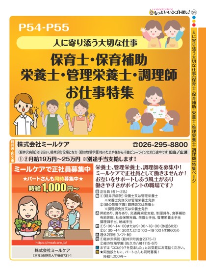 54人に寄り添う大切な仕事【保育士・保育補助・栄養士・管理栄養士・調理師】特集ページ●●●P54-P55保育士・保育補助栄養士・管理栄養士・調理師お仕事特集人に寄り添う大切な仕事株式会社ミールケア株式会社ミールケア[本社]長野市大字穂保731-1https://mealcare.jp/(軽井沢病院)R18沿い、軽井沢町役場となり(緑の牧場学園)ちゃたまや様から千曲ビューラインに向う途中です担当/広瀬栄養士、管理栄養士、調理師を募集中!ミールケアで正社員として働きませんか!お互いをサポートしあう風土があり働きやすさがポイントの職場です♪①②月給19万円∼25万円※別途手当支給します!☎026-295-8800軽井沢・佐久市正社員(各1∼2名)①[軽井沢病院]栄養士又は管理栄養士 ※栄養士免許又は管理栄養士免許②[緑の牧場学園]調理師又は栄養士 ※調理師免許又は栄養士免許昇給あり、賞与あり、交通費規定支給、制服貸与、食事補助有給休暇、社会保険完備、栄養士手当、管理栄養士手当調理師手当、地域手当①5:00∼14:00または9:00∼18:00(休憩60分)②5:30∼14:30または10:00∼19:00(休憩60分)週休2日制(シフト制)①軽井沢病院(軽井沢町長倉2375-1)②緑の牧場学園(佐久市八幡1115-67)まずは「ココどう?を見ました」とお気軽にお電話ください。★両施設ともに、パートさんも同時募集! 時給1,000円∼★パートさんも同時募集中★1,000時給円∼ミールケアで正社員募集中