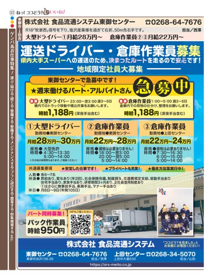 ねっ!ココどう?57ゲンバ系お仕事特集!運ぶ・届ける・建てる・警備する・整備する・メンテナンスする・プラン設計する・農業する・収集廃棄するetc. ●●●担当/西澤株式会社食品流通システム東御センターR18「牧家西」信号を下り、塩沢産業様を過ぎて右折、50m先右手です。担当/西澤大型ドライバー①月給28万円∼ 倉庫作業員②③月給22万円∼☎0268-64-7676☎0268-64-7676東御市・上田市人数●待遇●休日●各6∼7名昇給あり、賞与あり(年2回)、社会保険完備、制服貸与、交通費規定支給、皆勤手当あり住宅手当あり、家族手当あり、研修期間3ヶ月あり、正社員登用制度あり①はさらに無事故手当、乗務手当、マナー手当あり月8日∼9日(年間105日)資格●時間●大型免許4:30∼13:305:00∼14:00資格●時間●資格は必要ありません!18:00∼翌3:0020:00∼翌5:005:00∼14:00資格●時間●資格は必要ありません!7:30∼16:306:00∼15:005:00∼14:00HPもご覧ください県内大手スーパーへの運送のため、決まったルートを走るので安心です!月給28万円∼30万円時給1,188円月給22万円∼28万円①大型ドライバー大型ドライバー②倉庫作業員月給22万円∼24万円③倉庫作業員★安定した仕事です! ★プライベートも充実! ★働き方改革実行中!★週末働けるパート・アルバイトさん株式会社食品流通システム東御市加沢138-26上田市大屋630「ココどう?を見ました」とお気軽にお電話ください!東御センター担当/山田☎0268-34-5070上田センターhttps://srs-meito.co.jp時給円パート同時募集!パック作業員950勤務地●東御センター共通募集要項勤務地●東御センター勤務地●上田センター※その他の時間帯もあります。ご相談ください!運送ドライバー・倉庫作業員募集地域限定社員大募集23:00∼翌3:00週3∼5日構内でのトラック移動や積込作業をお願いします。(深夜手当含む)時給1,188円倉庫作業員1:00∼5:00週3∼5日倉庫内での荷物の仕分け、整理をお願いします。(深夜手当含む)急募急募東御センターで急募中です!急募中