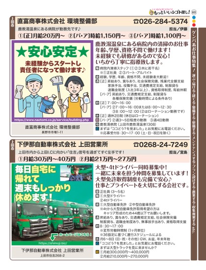 60ゲンバ系お仕事特集!運ぶ・届ける・建てる・警備する・整備する・メンテナンスする・プラン設計する・農業する・収集廃棄するetc. ●●●直富商事株式会社環境整備部直富商事株式会社環境整備部長野市市場1-11https://www.naotomi.co.jp/service/building.php鹿教湯温泉にある病院が勤務先です♪担当/伊藤鹿教湯温泉にある病院内の清掃のお仕事年齢、学歴、資格不問で働けます!未経験でも研修があるので安心!いちから丁寧に指導致します。①[正]月給20万円∼②[パ・ア]時給1,150円∼③[パ・ア]時給1,100円∼☎026-284-5374上田市病院内清掃スタッフ(①②③共に若干名)※①正社員②③パート・アルバイト経験、学歴、年齢、資格不問、未経験者大歓迎![正]昇給あり、賞与あり、社会保険完備、残業代全額支給 家族手当、役職手当、交通費規定支給、制服貸与 退職金制度(入社3年以上)、資格取得制度、有給休暇[パ・ア]昇給あり、交通費規定支給、制服貸与 各種保険完備(労働時間による条件あり)[正]7:00∼16:00[パ・ア]②7:00∼16:00または8:00∼12:30 ③8:00∼12:00(②はローテーション勤務です)[正]週休2日制(休日はローテーション)[パ・ア]②週3∼5日程度の勤務 ③週4日勤務鹿教湯病院(上田市鹿教湯温泉1308)まずは「ココどう?を見ました」とお気軽にお電話ください。※応募受付8:30∼17:00(土・日・祝日を除く)未経験からスタートし責任者になって働けます♪★安心安定★下伊那自動車株式会社上田営業所下伊那自動車株式会社上田営業所上田市住吉268-2上田市内から上田I.Cに向かい「住吉」信号を過ぎてすぐ左手です!担当/宮島大型・4tドライバー同時募集中!一緒に未来を担う仲間を募集しています!大型免許取得制度も完備で安心♪仕事とプライベートを大切にする会社です。①月給30万円∼40万円②月給21万円∼27万円☎0268-24-7249上田市正社員(3∼5名)①大型ドライバー②4tドライバー①大型自動車免許②中型自動車免許※4tから大型自動車免許取得希望の方は キャリア形成のため44歳以下でお願いします。昇給あり、賞与あり、交通費規定支給、社会保険完備制服貸与、退職金制度あり、無事故手当あり、資格取得支援8:30∼17:00※変形労働時間制(1ヶ月単位)※36協定に基づく運行スケジュールによる月6∼8日(日・祝・その他)GW、お盆、年末年始「ココどう?を見ました」とお気軽にお電話ください。まずは大型トラックを見に来ませんか?①月給300,000円∼400,000円②月給210,000円∼270,000円https://shimoji.biz/毎日自宅に帰れて週末もしっかり休めます!自宅にしっかります!ホームページはこちら!