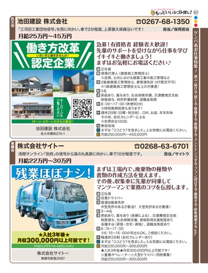 62ゲンバ系お仕事特集!運ぶ・届ける・建てる・警備する・整備する・メンテナンスする・プラン設計する・農業する・収集廃棄するetc. ●●●株式会社サイトー株式会社サイトー東御市新張2087浅間サンライン「別府」の信号から湯の丸高原に向かい、車で10分程度です。担当/サイトウまずは工場内で、廃棄物の種類や書類の作成方法を覚えます。その後、収集車に先輩が同乗してマンツーマンで業務のコツを伝授します。月給22万円∼30万円☎0268-63-6701東御市正社員収集ドライバー普通自動車免許中型免許のある方歓迎!大型免許ある方優遇!3∼4名昇給あり、賞与あり(実績による)、交通費規定支給制服貸与、社会保険完備、資格取得支援制度あり各種手当(家族・住宅・資格)、退職金制度あり8:15∼17:00※6:15∼15:00の早出もOK。ご相談ください。隔週休2日制(会社カレンダーあり)まずは「ココどう?を見ました」とお気軽にお電話ください。月給220,000円∼300,000円★入社3年後★月収300,000円以上可能です!☆重機オペレーター☆大型ドライバー同時募集!月給250,000円∼300,000円残業ほぼナシ!https://53-no-saito.com/★入社3年後★月収300,000円以上可能です!池田建設株式会社池田建設株式会社佐久市横和274-1「三河田工業団地信号」を西に向かい、車で2分程度、上原猿久保線沿いです!担当/採用担当急募!有資格者経験者大歓迎!先輩のサポートを受けながら仕事を学びイキイキと働きましょう!まずはお気軽にお電話ください♪月給25万円∼45万円☎0267-68-1350佐久市正社員現場代理人(建築施工管理技士)※民間、公共における建築工事の施工管理など2級建築施工管理技士、要普通免許(AT限定不可)※1級建築施工管理技士以上の方優遇!3名昇給あり、賞与あり、社会保険完備、交通費規定支給制服貸与、財形貯蓄制度、退職金制度8:00∼17:00(休憩90分)※時短勤務制度もあります!週休2日制(日曜・祝日他)、GW、お盆、年末年始その他、会社カレンダーによる※年間休日100日東信地域まずは「ココどう?を見ました」とお気軽にお電話ください。月給250,000円∼450,000円ホームページもご覧ください働き方改革認定企業Iターン・Uターンの方も大歓迎!いきいきと働きませんか!