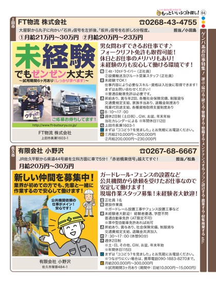 64ゲンバ系お仕事特集!運ぶ・届ける・建てる・警備する・整備する・メンテナンスする・プラン設計する・農業する・収集廃棄するetc. ●●●有限会社小野沢有限会社小野沢佐久市塚原484-1JR佐久平駅から県道44号線を立科方面に車で5分!「赤岩橋東信号」越えてすぐ!担当/松島ガードレール・フェンスの設置など公共機関から依頼を受けたお仕事なので安定して働けます!現場作業スタッフ募集!未経験者大歓迎!月給20万円∼30万円☎0267-68-6667佐久市正社員1名建設作業員※ガードレール設置工事やフェンス設置工事など未経験者大歓迎!経験者優遇、学歴不問普通自動車免許(AT限定不可)※準中型自動車免許あれば尚可昇給あり、賞与あり、社会保険完備、制服貸与交通費規定支給、退職金共済加入7:30∼17:00(休憩90分)週休2日制※土・日、その他、GW、お盆、年末年始※年間休日115日まずは「ココどう?を見ました」とお気軽にお電話ください。※つながりにくい場合は、携帯電話090-1883-8270まで。月給200,000円∼300,000円※試用期間3ヶ月あり(期間中:日給10,000円∼15,000円)新しい仲間を募集中!業界が初めての方でも、先輩と一緒に作業するので安心して働けます!公共機関依頼の仕事がメイン!安心です!FT物流株式会社FT物流株式会社上田市長瀬1603-1大屋駅から丸子に向かい「石井」信号を左折後、「坂井」信号を右折し5分程度。担当/小田島男女問わずできるお仕事です♪フォークリフト免許も取得可能!休日とお仕事のメリハリもあり!未経験の方も安心して働ける環境です!①月給21万円∼30万円②月給20万円∼23万円☎0268-43-4755上田市①4t・10tドライバー(正社員)②設備輸送及びルート営業スタッフ(正社員)未経験でOK!仕事内容により必要なスキル・資格は入社後に取得できます!まずはお問い合わせください!※普通自動車免許は必要です。昇給あり、賞与年2回、各種社会保険完備、制服貸与交通費規定支給、家族手当あり、退職金制度あり残業代別途支給、各種資格取得支援制度あり8:10∼17:00週休2日制(土日祝)、GW、お盆、年末年始当社カレンダーによる※年間休日112日上田市長瀬1603-1まずは「ココどう?を見ました」とお気軽にお電話ください。①月給210,000円∼300,000円②月給200,000円∼230,000円http://www.ft-butsuryu.co.jp/未経験でもゼンゼン大丈夫∼試用期間6ヶ月あり(しっかり学べます)∼ご応募お待ちしてます!
