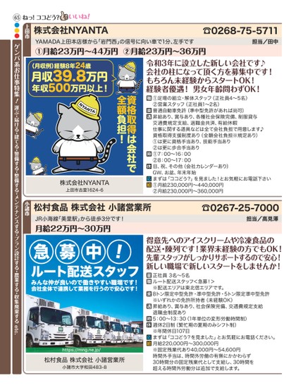 ねっ!ココどう?65ゲンバ系お仕事特集!運ぶ・届ける・建てる・警備する・整備する・メンテナンスする・プラン設計する・農業する・収集廃棄するetc. ●●●株式会社NYANTA株式会社NYANTA上田市古里1624-6YAMADA上田本店様から「岩門西」の信号に向い車で1分、左手です担当/田中令和3年に設立した新しい会社です♪会社の柱になって頂く方を募集中です!もちろん未経験からスタートOK!経験者優遇!男女年齡問わずOK!①月給23万円∼44万円②月給23万円∼36万円☎0268-75-5711上田市①足場の組立・解体スタッフ(正社員4∼5名)②営業スタッフ(正社員1∼2名)普通自動車免許(準中型免許があれば尚可)昇給あり、賞与あり、各種社会保険完備、制服貸与交通費規定支給、退職金共済、有給休暇仕事に関する道具などは全て会社負担で用意します♪資格取得支援制度あり(全額会社負担※規定あり)①は更に資格手当あり、技能手当あり②は更に歩合手当あり①7:00∼16:00②8:00∼17:00日、祝、その他(会社カレンダーあり)GW、お盆、年末年始まずは「ココどう?」を見ました!とお気軽にお電話下さい①月給230,000円∼440,000円②月給230,000円∼360,000円月収39.8万円(月収例)経験8年24歳年収500万円以上!資格取得は会社で全額負担!松村食品株式会社小諸営業所松村食品株式会社小諸営業所小諸市大字和田483-8https://mng.ne.jp/JR小海線「美里駅」から徒歩3分です!担当/高見澤得意先へのアイスクリームや冷凍食品の配送・陳列です!業界未経験の方でもOK!先輩スタッフがしっかりサポートするので安心!新しい職場で新しいスタートをしませんか!月給22万円∼30万円☎0267-25-7000小諸市正社員3名∼5名ルート配送スタッフ<急募!>※配送エリアは東北信エリアです。8トン限定中型免許・準中型免許・5トン限定準中型免許※いずれかの免許所持者(未経験OK)昇給あり、賞与あり、社会保険完備、交通費規定支給退職金制度あり5:00∼13:30(1年単位の変形労働時間制)週休2日制(繁忙期の夏期のみシフト制)※年間休日107日まずは「ココどう?を見ました」とお気軽にお電話ください。月給220,000円∼300,000円※固定残業代あり40,000円∼54,600円時間外手当は、時間外労働の有無にかかわらず30時間分の固定残業代として支給し、30時間を超える時間外労働分は追加で支給します。ルート配送スタッフみんな仲が良いので働きやすい職場です!会社全体で連携して業務を行うので安心です!急募中!
