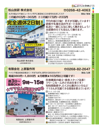 70時代をリードする!ものづくり工場・製造ワーク求人特集!おうちでココどう!https://cocodou.info●●●有限会社上原製作所有限会社上原製作所坂城町南条262-3https://www.uehara-s.co.jp/ベイシア薬品坂城店様近く!R18「ねずみ」信号から約300mです!担当/上原医療機器の組立・検査スタッフ急募!クリーンルーム内でのお仕事です♪短時間勤務や、たくさん働きたい方などママさんが活躍できる環境を整えています♪時給980円∼1,800円★月収例★10万円以上可能です!☎0268-82-2647坂城町パート※2∼3名医療機器の組立・検査スタッフ必要ありません!未経験でOKです!昇給あり、賞与あり(パートさんでも支給しています!)社会保険完備、交通費規定支給、制服貸与9:00∼15:00でOK!1日4時間から勤務OK!★8:30∼17:30のフルタイムも相談OKです!★扶養範囲内や、たくさん稼ぎたい方などお気軽にご相談ください♪週3日∼勤務OKです!★土・日・祝休みで完全週休2日制でも働けます♪まずは「ココどう?を見ました」とお気軽にお電話ください。★正社員同時募集中!月給200,000円∼280,000円 部品加工のお仕事です!完全週休2日制です!時給980円∼1,800円(研修中:時給948円)週3日∼9時∼15時勤務OK★★ママさんが活躍できる ★時間で急募中★松山技研株式会社松山技研株式会社上田市長瀬1050丸子方面より千曲ビューライン平戸工業団地入口の信号を右折してスグ担当/吉池平均年齢37歳!若手が活躍しています!研修や先輩社員のサポート充実!私達と一緒に元気に楽しく働きましょう♪未経験の方でも安心して働けます。①月給20万円∼30万円②③月給17万円∼23万円☎0268-42-4063上田市①営業スタッフ(正社員)1名②コーティング加工オペレーター(正社員)1名③熱処理加工オペレーター(正社員)1名36歳以下(キャリア形成のため)高校以上、普通自動車運転免許(AT限定可)昇給あり、賞与あり、各種社会保険完備、制服貸与、出張手当祝い金あり(結婚・出産)、家族手当、資格手当、技能手当交通費規定支給、退職金共済あり、退職金制度あり8:20∼17:00※②③は仕事に慣れた時点で交替制をお願いします。完全週休2日制(会社カレンダーあり)GW、お盆、年末年始※年間休日115日上田市の4工場まずは「ココどう?を見ました」とお気軽にお電話ください。①月給200,000円∼300,000円②③月給170,000円∼230,000円完全週休2日制!https://www.matsuyama-giken.co.jp/ホームページもご覧ください。平均年齢37歳!若手が活躍中!プライベートも充実![月収例]278,000円[年収例]4,510,000円28歳・加工職・勤続2年