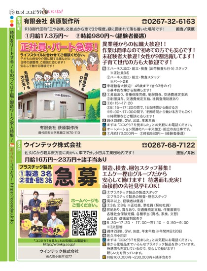 ねっ!ココどう?75時代をリードする!ものづくり工場・製造ワーク求人特集!おうちでココどう!https://cocodou.info●●●有限会社荻原製作所有限会社荻原製作所御代田町大字馬瀬口1670-110R18御代田町「三ツ谷東」交差点から車で3分程度。緑に囲まれて落ち着いた場所です!担当/荻原異業種からの転職大歓迎!!作業は簡単なので初めての方でも安心です!未経験者大歓迎!女性が9割活躍してます!子育て世代の方も大歓迎です!①月給17.3万円∼ ②時給980円∼(経験者優遇)☎0267-32-6163御代田町①ハーネス加工・組立・検査(出荷検査も行う)スタッフ ※正社員3名②ハーネス加工・組立・検査スタッフ ※パート2名未経験者大歓迎!45歳まで(省令3号のイ)※基本的な事から指導します!①昇給あり、各種保険完備、制服貸与、交通費規定支給②制服貸与、交通費規定支給、社員登用制度あり①8:15∼17:20②8:15∼17:20の間で、1日5時間から働ける方※9:00∼17:00の間で、1日5時間から働ける方でもOK!※時間帯などご相談に応じます!週休2日制、GW、お盆、年末年始まずは「ココどう?を見ました」とお気軽にお電話ください。オートメーション関連のハーネス加工・組立のお仕事です。①月給173,000円∼②時給980円∼(経験者優遇)未経験でも 大丈夫!子どもの病気や介護に関する事などの日時の調整等、ご相談に応じます!安心して働ける環境です!職場見学もOK!正社員・パート急募!ライフスタイルに合わせてご相談ください。ウインテック株式会社ウインテック株式会社佐久市小田井1077佐久ICから軽井沢方面に向かい、車で7分。小田井工業団地内です!担当/井出製造、検査、梱包スタッフ募集!エムケー樫山グループだから安心して働けます!待遇面も充実!面接前の会社見学もOK!月給16万円∼23万円+諸手当あり☎0267-68-7122佐久市①プラスチック製品の製造スタッフ②プラスチック製品の検査・梱包スタッフ高卒以上、経験者は優遇!①3名②3名※正社員、準社員(契約社員)昇給あり、賞与あり、交通費規定支給、作業服貸与各種社会保険完備、各種手当(資格、家族、交替)正社員:退職金制度あり8:30∼17:20・17:00∼翌1:10・0:50∼9:00※3交替制週休2日制、GW、お盆、年末年始※年間休日120日佐久市小田井まずは「ココどう?を見ました」とお気軽にお電話ください。車から化粧品までいろんなプラスチック製品を作っています。待遇面も充実しているので、安心して働けます!新しい力を待っています。月給160,000円∼230,000円+諸手当ありhttp://wtmkg.co.jp/「ココどう?を見た」とお気軽にお電話を!急募プラスチック製品①製造3名②検査・梱包3名ホームページもご覧ください。