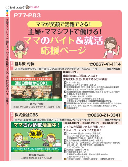 ねっ!ココどう?77主婦・ママシフトで働ける!【ママを応援ページ】ママの就活&バイト特集!●●●P77-P83ママが笑顔で活躍できる!主婦・ママシフトで働ける!ママのバイト&就活のバイト&就活応援ページ①スーパーの品出し2∼4名(派遣社員)②スーパーのレジ3∼4名(派遣社員)③接客販売(アパレル)各2名(派遣社員)社会保険完備、交通費規定支給、制服貸与①8:00∼13:00または12:00∼21:00(1日5時間∼勤務OK)②9:30∼21:00の間で1日5∼8時間勤務③10:00∼19:00完全週休2日制(シフト制)①軽井沢の生鮮スーパー②軽井沢・小諸・佐久穂・篠ノ井の生鮮スーパー③軽井沢のアウトレット内①時給1,130円∼②時給1,200円∼③時給1,350円∼株式会社CBS株式会社CBS上田市住吉377-11武蔵テクノビル1F軽井沢・小諸・佐久穂・篠ノ井の生鮮スーパーと軽井沢のアウトレット内です!担当/ナカジマママさんが活躍できるお仕事です♪大手スーパーでスタッフ大募集!①時給1,130円∼②時給1,200円∼③時給1,350円∼☎0268-21-3341東信エリア労働者派遣事業許可番号(派20-300381)●有料職業紹介事業(20-ユ-300222)急募「ココどう?を見ました」とお気軽にお電話ください。ママさん多数活躍中!さん多数活躍中!品出しレジ週2日勤務からOK!未経験の方でも仲間がサポートするから安心!アルバイト2名販売スタッフ(レジ・接客・品出し)未経験者歓迎!学生・主婦(夫)、土日祝日入れる方大歓迎!長期できる方、フルタイム希望の方は応相談交通費規定支給、社会保険完備、制服貸与(シャツ、エプロン)社割あり、有給休暇あり9:30∼19:30の間で応相談※上記時間帯で1日5時間から勤務できる方※季節によって変動あり※営業時間は施設に準ずる週2日勤務からOK(シフト制・応相談)希望をお聞かせください。まずは「ココどう?を見ました」とお気軽にお電話ください。時給980円∼軽井沢旬粋軽井沢旬粋軽井沢・プリンスショッピングプラザ・スーベニアコート内https://kk-takachiho.jp/JR軽井沢駅からすぐ!軽井沢・プリンスショッピングプラザ・スーベニアコート内担当/大久保出勤日時はご相談に応じます!主婦(夫)、学生、長期できる方大歓迎!時給980円∼☎0267-41-1114軽井沢