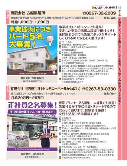 82主婦・ママシフトで働ける!【ママを応援ページ】ママの就活&バイト特集!●●●有限会社川西典礼社(セレモニーホールかわにし)有限会社川西典礼社佐久市協和130-1佐久方面よりR142「東信免許センター」信号を右折してすぐです!担当/高村葬祭プランナー2名募集!未経験でも歓迎!先輩社員が丁寧に指導・サポートするので安心して働けます。経験者は優遇!女性も活躍できる職場です!月給20万円∼26万円☎0267-53-0330佐久市正社員2名葬祭プランナー※通夜、葬儀当日の会場設営、片づけや清掃セレモニーホールの維持・管理などのお仕事です。50歳まで(省令3号のイ)、普通自動車免許、中型免許あれば尚可男女スタッフ活躍中!昇給あり、賞与あり、社会保険完備、交通費規定支給マイカー通勤可、退職金制度あり8:00∼17:00(残業月20時間程度あり)週休2日制(シフト制)※自社勤務表を元に月10日※年間休日120日佐久市協和(セレモニーホールかわにし)まずは「ココどう?を見ました」とお気軽にお電話ください。故人の最後をお手伝いする使命感、責任感あるお仕事です。遺族からの感謝の言葉によってやりがいのあるお仕事です。月給200,000円∼260,000円http://ceremonyhall-kawanishi.com/正社員2名募集!月10日間の休日で、しっかり休めます!I・Uターンの方も歓迎!有限会社古越製麺所有限会社古越製麺所御代田町馬瀬口877-5R18を小諸から御代田に向かい「平原東」信号を過ぎて左カーブの先の看板が目印!担当/古越事業拡大につきスタッフ大募集!安定した室温の清潔な環境で働けます!未経験者の方でも先輩スタッフがサポートしてくれるので安心して働けます!時給1,000円∼1,200円☎0267-32-2009御代田町パート5名製造・検品・出荷作業スタッフ高卒以上、普通自動車免許(AT限定可)未経験者大歓迎!昇給あり、各種社会保険交通費規定支給、制服貸与マイカー通勤OK、有給休暇8:00∼17:00・9:00∼16:00・13:00∼17:00※上記時間帯で働ける方週休2日(土曜日・日曜日)※祝祭日は出勤(その他応相談)まずは「ココどう?を見ました」とお気軽にお電話ください。新しい工場の清潔な環境で汚れることもありません。年間を通して安定した室温で快適に仕事ができます!出勤日・時間などご相談に応じます!時給1,000円∼1,200円※経験者は優遇します!https://www.furukoshi.co.jp/大募集!パート名事業拡大につき5