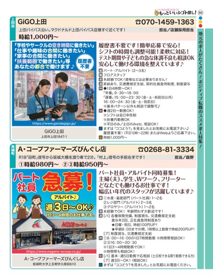 86地元の求人がたくさん!ポジティブ転職のススメ求人特集!●●●A・コープファーマーズびんぐし店A・コープファーマーズびんぐし店坂城町大字上五明字久保田610R18「田町」信号から坂城大橋を渡り車で2分。「村上」信号の手前右手です!担当/庭野パート社員・アルバイト同時募集!主婦(夫)、学生、Wワーク、フリーターどなたでも働けるお仕事です!幅広い年代のスタッフが活躍しています♪①時給980円∼②③時給950円∼☎0268-81-3334坂城町①水産・畜産部門(パート社員)1∼2名②レジ部門(アルバイト)2∼3名③グロサリー(アルバイト)1∼2名未経験でOK!年齢問わず大歓迎です![パ]各種保険完備、制服貸与、交通費規定支給 賞与年2回、正社員登用制度あり ★日曜・祝日、時給100円UP! ★早朝8:00までの間、1時間以上勤務で時給200円UP![ア]制服貸与、交通費規定支給①8:00∼16:00の1日7時間勤務※時間帯相談OK!②③16:00∼20:30※1日3∼4時間勤務でOK!※時間帯も相談OK![パ]基本:週5日勤務で応相談(土日祝できる限り勤務できる方)[ア]週3日∼OK!(相談OK)まずは「ココどう?を見ました」とお気軽にお電話ください。https://www.nagano-acoop.co.jp/パート社員急募!1日3∼4時間のお仕事です。週日∼アルバイト♪OK♪3GiGO上田GiGO上田上田市上田1847-1https://www.gendagigo.jp/上田バイパス沿い。マクドナルド上田バイパス店様すぐ近くです!担当/店舗採用担当履歴書不要です!簡単応募で安心!シフトの時間も調整可能!柔軟に対応!テスト期間や子どもの急な体調不良も相談OK安心して働ける環境を整えています♪時給1,000円∼☎070-1459-1363上田市パート・アルバイト(2∼3名)フロアスタッフ未経験でOK!資格などは必要ありません!昇給あり、交通費規定支給、契約社員登用制度、制服貸与◆1日4時間∼OK!「早番」9:30∼18:00「遅番」15:00∼23:30(金・土・祝前日以外)16:00∼24:30(金・土・祝前日)※基本パターン以外も相談で調整可♪◆週2日∼勤務OK!※シフトは自己申告制※扶養内勤務OK※平日のみ/土日のみetc.相談OK!まずは「ココどう?」を見ましたとお気軽にお電話下さい♪履歴書不要!(平日10時∼22時)またはWebよりご応募下さい。時給1,000円∼「学校やサークルの空き時間に働きたい」「仕事や趣味の合間に働きたい」「家事の合間に働きたい」「扶養範囲で働きたい」等あなたの都合で働けます♪履歴書不要
