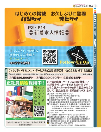 6●●●はじめて掲載!お久しぶり掲載特集!はじめての掲載お久しぶりに登場P2-P14コンパクトで便利な地元の求人情報をタイムリーにココどう?公式X@cocodounaganoファシリティ・マネジメント・サービス株式会社長野工場☎0268-67-3352「島川原」信号をこぶし街道方面に曲り、道の駅「みまき」すぐ近くです!①月給186,500円〜②月給220,050円〜③時給948円〜担当/遠山東御市・その他正社員2職種・パートさん同時募集中♪未経験からスタートできるお仕事です!大手文具メーカーからの文房具製品の注文を受けて、製品を生産・販売を行っています。①営業スタッフ(正社員2〜3名)②総務・経理管理スタッフ(正社員若干名)③事務スタッフ(パート若干名)①40歳まで(省令3号のイ)②45歳まで(省令3号のイ)経験者各種資格保持者優遇③未経験OK!年齢不問です♪①②昇給あり、賞与あり、社会保険完備、交通費規定支給制服貸与、資格手当あり、家族手当あり、住宅手当あり物価手当あり、退職金共済あり、退職金制度あり③昇給、交通費規定支給、制服貸与、正社員登用あり①②8:30〜17:30③1日5時間〜勤務OK(午後からなどもOKです♪)週休2日制(土日祝休み※2・3月は土曜日の出勤あり)※年間休日122日※パートさんは出勤日数など相談OK♪①東京都中央区新川1-3-21②③東御市島川原421-1①月給186,500円〜260,500円②月給220,050円〜305,000円③時給948円〜ファイルやバインダーを製作する会社正社員積極採用中!https://www.nikko-fams.biz/ファシリティ・マネジメント・サービス株式会社長野工場東御市島川原421-1