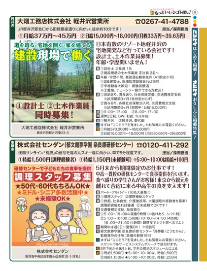 8●●●はじめて掲載!お久しぶり掲載特集!担当/採用担当JR軽井沢駅北口から旧軽銀座通りに向かい、徒歩約10分です!①月給37万円〜45万円②日給15,000円〜18,000円(月収33万円〜39.6万円)道を造る・宅地を開く・家を建てる建設現場で働く日本有数のリゾート地軽井沢の宅地開発など行っている会社です!設計士、土木作業員募集!年齢・学歴問いません!①設計士正社員1名②建設現場の土木作業員正社員2名〜年齢・学歴不問、要普通自動車免許(AT限定不可)①2級建築士、現場監理経験あれば尚可②未経験者大歓迎!経験者優遇!※②重機、チェーンソー操作できる方歓迎!①昇給あり、賞与あり、社会保険完備、交通費規定支給※試用期間3ヶ月(条件変わらず)②賞与あり、各種社会保険加入可、交通費規定支給※試用期間3ヶ月(期間中:日給15,000円)①9:00〜17:00②8:00〜17:00週休2日制、GW、お盆、年末年始①軽井沢②軽井沢、御代田まずは「ココどう?を見ました」とお気軽にお電話ください。①月給370,000円〜450,000円②日給15,000円〜18,000円(月収330,000円〜396,000円)①設計士②土木作業員同時募集!大畑工務店株式会社軽井沢営業所軽井沢町軽井沢東23-3☎0267-41-4788大畑工務店株式会社軽井沢営業所軽井沢担当/採用担当浅間サンライン「別府」の信号を湯の丸スキー場に向かい、車で5分程度です。①時給1,500円(調理経験者)②時給1,150円(未経験可)※5:00〜10:00は時給+100円☎0120-411-292株式会社センダン(郁文館夢学園奈良原研修センター)東御市研修センターで子どもたちの食事を提供調理スタッフ募集★50代・60代もちろんOK★★ミドル・シニア多数活躍中★★未経験OK★https://sendan-ltd.jp株式会社センダン東京都中央区日本橋小伝馬町10-1(本社)5月末から期間限定のお仕事です!中高一貫校の研修センターで食事提供を行います。食べ盛りの学生さんがお客様!東京から親元を離れて合宿に来る中高生の食を支えます!パート・アルバイト(10名大募集!)①調理スタッフ②調理補助スタッフ①旅館、社員食堂、介護施設等、大量調理の経験者を募集!調理師資格あれば優遇②未経験でOKです!交通費規定支給、制服貸与①5:00〜19:00の実働9時間(中抜けあり、シフト制)②5:00〜10:00(5時間)10:00〜14:00(4時間)16:00〜21:00(4時間)朝昼夜でシフト選べますよ♪期間中は週2日〜勤務OK!※相談可郁文館夢学園奈良原研修センター「鴻夢館(こうむかん)」勤務場所の住所:東御市新張1931まずは「ココどう?を見ました」とお気軽にお電話ください。※セントラルサービスシステムグループで受付けます。5月下旬から9月上旬、学生の宿泊スケジュールによる①時給1,500円★5:00〜10:00は、時給1,600円②時給1,150円★5:00〜10:00は、時給1,250円