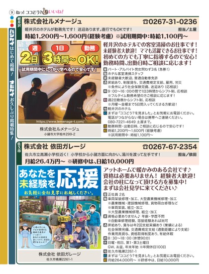 ☎0267-31-0236軽井沢のホテルが勤務先です!送迎あります。直行でもOKです!時給1,200円〜1,600円(経験考慮)※試用期間中:時給1,100円〜担当/土屋2週日331日時間〜勤務OK!試用期間中にしっかり学べるので安心です!https://www.lemenage-t.com/株式会社ルメナージュ小諸市大字柏木299-2軽井沢のホテルでの客室清掃のお仕事です!未経験者大歓迎!ママも活躍できるお仕事です!初めての方でも丁寧に指導するので安心!勤務時間、出勤日時ご相談に応じます!パート・アルバイト男女問わず3名(急募!)ホテル客室清掃スタッフ未経験者大歓迎、普通自動車免許昇給あり、制服貸与、交通費規定支給、雇用、労災※条件により社会保険完備、送迎あり(応相談)9:00〜16:00の間で1日3時間からシフト制、応相談※フルタイム勤務希望の方ご相談に応じます!週2日勤務からシフト制、応相談※月曜〜金曜まで5日間入ってくださる方歓迎!軽井沢のホテルまずは「ココどう?を見ました」とお気軽にお電話ください。電話がつながらない場合は携帯へご連絡ください。080-7221-4649土屋まで。勤務時間・出勤日時、ご相談に応じるので安心です!時給1,200円〜1,600円(経験考慮)※試用期間中:時給1,100円〜株式会社ルメナージュ軽井沢ねっ!ココどう?9●●●はじめて掲載!お久しぶり掲載特集!アットホームで暖かみのある会社です♪資格は必要ありません!経験者大歓迎!会社の柱になって頂ける方を募集中!まずは会社見学に来てください♪正社員2名車両架装修理・加工、大型農業機械修理・加工※農業機械・建設機械修理、貨物荷台修理など※車両架装、組立・加工※大型農業機械修理、組立・加工資格必要ありません♪年齢・学歴不問※自動車修理経験、溶接経験あれば尚可昇給あり、賞与は年2回支給実績あり(業績による)社会保険完備、交通費規定支給(通勤距離により支給)作業用具貸与、資格取得制度あり、有給休暇8:30〜18:00(休憩90分)日曜・祝日、第1・第3土曜日GW、お盆、年末年始※年間休日100日佐久市鳴瀬2261-1まずは「ココどう?を見ました」とお気軽にお電話ください。月給264,000円〜※研修中は、日給10,000円☎0267-67-2354担当/依田佐久市立高瀬小学校近く!小学校から小諸方面に向かい、湯川を渡って左手です!月給26.4万円〜※研修中は、日給10,000円株式会社依田ガレージ佐久市あなたを未経験を応援お気軽に会社見学にお越しください。工場の中には、プロが使用する機械や道具がいっぱい!あなたも技術を身につけて、将来を開きませんか!?株式会社依田ガレージ佐久市鳴瀬2261-1