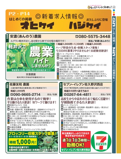 12●●●はじめて掲載!お久しぶり掲載特集!P2-P14はじめての掲載お久しぶりに登場☎080-5575-3448担当/安濃(あんのう)①時給1,000円〜1,100円②時給1,000円ハーブ野菜の生産・収穫スタッフ募集!今注目の「農業」やりませんか!未経験者歓迎!パート・アルバイト3名位①生産作業スタッフ②収穫作業スタッフ年齢・経験不問、中高年の方でもOK!①経験者優遇、要普通自動車免許昇給あり、労災①8:00〜12:00②6:00〜10:00又は7:00〜11:00※時間帯ご相談に応じます。週休2日(月・金)週5日勤務(土・日含む)※勤務時期ご相談に応じますまずは「ココどう?を見ました」とお気軽にお電話ください。2024年5月中旬〜10月下旬までの期間限定のお仕事です。①時給1,000円〜1,100円②時給1,000円ルグラン軽井沢近く。追分駅から車で10分程の場所です!安濃(あんのう)農園軽井沢で農業バイトしませんか?軽量野菜の生産・収穫に関わる簡単軽作業です!軽井沢安濃農園軽井沢町大字発地字供養塚2651-6セブン-イレブン佐久野沢西店R141「野沢西信号」を野沢北高校方面に曲がってスグです!時給948円+諸手当あり☎0267-64-4811担当/甘利高校生から中高年の方まで幅広く活躍中!早朝勤務できる方大歓迎!佐久市パート・アルバイトレジ・接客販売・店内清掃・商品陳列・品出し・発注など年齢不問、WワークOK!高校生や主婦(夫)の方からシニアの方まで歓迎!制服貸与、昇給制度、有給休暇あり、マイカー通勤可①6:00〜12:00②12:00〜18:00※1日3時間から応相談週1日勤務からOK!週5日勤務も応相談♪まずは「ココどう?を見ました」とお気軽にお電話ください。時給948円+諸手当ありセブン-イレブン佐久野沢西店佐久市野沢479-6発注業務がしっかりできる方発注手当が付きます♪週1日1日3時間〜勤務OK!セブン-イレブン佐久野沢西店小諸市菱平周辺の農場(数ヶ所)が勤務地です!時給1,000円☎090-9665-2714担当/佐藤作業は台車を使用するので簡単!平日働ける方大歓迎!Wワークで働けます!短期アルバイト10名ブロッコリーの収穫作業年齢・経験不問、未経験者歓迎!自動車やバイクなどで農場に通える方。収穫作業なので体力が必要です。交通費(1日200円)、カッパ、長靴、手袋などの備品支給5:00〜12:00の間で1日1時間からでもOK!※応相談週1〜2日勤務からOK!※応相談まずは「ココどう?を見ました」とお気軽にお電話ください。6月1日〜6月30日、9月1日〜9月30日の期間限定です。※天候により、期間が前後することがあります。佐藤友和農園小諸市乙665-2ファミリーハイツサトウA号ブロッコリー収穫スタッフ募集!6/1〜6/30・9/1〜9/30期間限定!時給1,000円!午前中のお仕事です!出勤時間・出勤日は自由!お気軽にご応募ください!佐藤友和農園小諸市