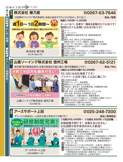 臼田野沢バイパス「野沢西信号」を前山地区グラウンドに向かい、すぐ近く!時給1,100円〜1,300円ホームヘルパー急募中!職場未経験の方でもOKです!質問だけでもお問い合わせOKです!時間〜OK!日〜1日1週2担当/相澤勤務出勤日時は、お子さんの行事や家庭のご都合に合わせやすいです!☎0267-63-7646株式会社穂乃里佐久市●●●13ねっ!ココどう?はじめて掲載!お久しぶり掲載特集!パートホームヘルパー介護職員初任者研修修了者、普通自動車免許2名雇用、労災、条件により社会保険加入資格手当あり、マイカー通勤可、交通費規定支給7:00〜17:00の間で、1日2〜3時間勤務※応相談週1日勤務からOK!※出勤日応相談佐久市小宮山まずは「ココどう?を見ました」とお気軽にお電話ください。訪問先より直行直帰も可能!シフト制30時間未満での就業です!時給1,100円〜1,300円☎0267-62-5121担当/中山野沢橋「野沢橋南詰信号」を野沢南高校方面に曲り、野沢児童館近くです!山喜ソーイング株式会社信州工場佐久市子育て中の方も働きやすい♪働やい日給6,648円(月額142,268円)16:30にはお仕事終了です♪プライベート充実!楽しく元気に働こう!未経験者歓迎!女性が8割以上活躍中!山喜ソーイング株式会社信州工場佐久市原138正社員3名急募!生産オペレーター、納品業務簡単なパソコン操作ができる方昇給あり、賞与あり、社会保険完備、交通費規定支給8:30〜16:30(実働7時間)日曜、祝日、その他年間休日カレンダーによるGW、お盆、年末年始※年間休日118日育児休業あり、介護休業あり、看護休業ありまずは「ココどう?を見ました」とお気軽にお電話ください。創業73年を迎える山喜グループの会社です!日給6,648円(月額142,268円)※試用期間あり(3ヶ月間・同条件)デニーズ上田店近く、上田市立西小学校のウラ側です!男女問わず活躍中!研修制度充実!経験豊富なスタッフがフォローします。①月給205,400円〜②日給8,890円※下記詳細実務経験不問です!夜勤もありません♪会社説明や見学希望のみも大歓迎!☎025-248-7200担当/採用担当アースサポート上田上田市①生活相談員(正社員)②デイへルパー(アルバイト)①社会福祉士、精神保健福祉士、社会福祉主事介護福祉士※いずれかの資格必須②未経験、介護の資格なしでOK!※①②要普通免許(AT限定可)①②昇給あり、制服貸与、交通費規定支給、有給休暇あり①はさらに、賞与年2回、社会保険完備、退職金制度あり8:30〜17:30①月9日休みのシフト制(2月は8日)②週1日〜勤務OK!まずは「ココどう?を見ました」とお気軽にお電話ください。①月給205,400円〜(固定残業代34時間40,800円含む)※時間超過分は別途支給+資格手当・スキル手当あり②日給8,890円+勤務手当・土日祝手当ありhttps://www.earthsupport.co.jp/アースサポート上田上田市常磐城5-1-26株式会社穂乃里佐久市小宮山148