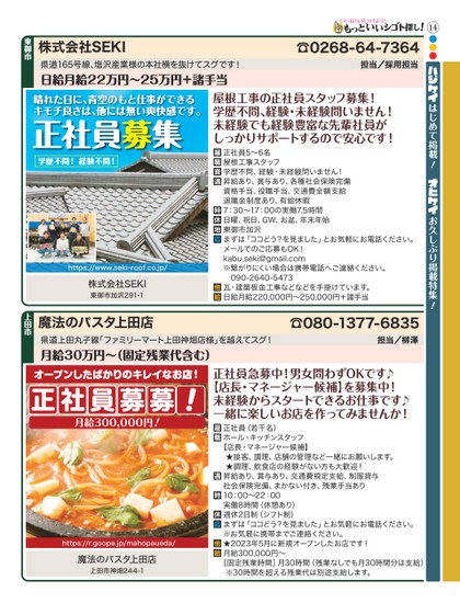 14●●●はじめて掲載!お久しぶり掲載特集!☎0268-64-7364担当/採用担当株式会社SEKI県道165号線、塩沢産業様の本社横を抜けてスグです!日給月給22万円〜25万円+諸手当東御市晴れた日に、青空のもと仕事ができるキモチ良さは、他には無い爽快感です。正社員募集学歴不問!経験不問!https://www.seki-roof.co.jp/株式会社SEKI東御市加沢291-1屋根工事の正社員スタッフ募集!学歴不問、経験・未経験問いません!未経験でも経験豊富な先輩社員がしっかりサポートするので安心です!正社員5〜6名屋根工事スタッフ学歴不問、経験・未経験問いません!昇給あり、賞与あり、各種社会保険完備資格手当、役職手当、交通費全額支給退職金制度あり、有給休暇7:30〜17:00の実働7.5時間日曜、祝日、GW、お盆、年末年始東御市加沢まずは「ココどう?を見ました」とお気軽にお電話ください。メールでのご応募もOK!kabu.seki@gmail.com※繋がりにくい場合は携帯電話へご連絡ください。090-2640-5473瓦・建築板金工事などなどを手掛けています。日給月給220,000円〜250,000円+諸手当☎080-1377-6835担当/柳澤魔法のパスタ上田店県道上田丸子線「ファミリーマート上田神畑店様」を越えてスグ!月給30万円〜(固定残業代含む)上田市オープンしたばかりのキレイなお店!正社員募募!月給300,000円!正社員急募中!男女問わずOKです♪【店長・マネージャー候補】を募集中!未経験からスタートできるお仕事です♪一緒に楽しいお店を作ってみませんか!正社員(若干名)ホール・キッチンスタッフ【店長・マネージャー候補】★接客、調理、店舗の管理など一緒にお願いします。★調理、飲食店の経験がない方も大歓迎!昇給あり、賞与あり、交通費規定支給、制服貸与社会保険完備、まかない付き、残業手当あり10:00〜22:00実働8時間(休憩あり)週休2日制(シフト制)まずは「ココどう?を見ました」とお気軽にお電話ください。※お気軽に携帯までご連絡ください。★2023年5月に新規オープンしたお店です!月給300,000円〜[固定残業時間]月30時間(残業なしでも月30時間分は支給)※30時間を超える残業代は別途支給します。https://r.goope.jp/mahopaueda/魔法のパスタ上田店上田市神畑244-1