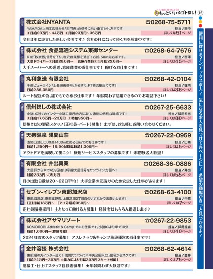 16●●●便利に探せるインデックス求人!気になる求人を見つけて各ページに!希望の職場がきっと見つかるよ!☎0268-75-5711担当/田中詳しくは51ページ株式会社NYANTAYAMADA上田本店様から「岩門西」の信号に向い車で1分、左手です①月給23万円〜44万円②月給23万円〜36万円上田市令和3年に設立した新しい会社です♪会社の柱になって頂く方を募集中です!☎0268-64-7676担当/西澤詳しくは45ページ大手スーパーへの運送、倉庫作業のお仕事です!稼げるお仕事です!株式会社食品流通システム東御センターR18「牧家西」信号を下り、塩沢産業様を過ぎて右折、50m先右手です。大型ドライバー①月給28万円〜倉庫作業員②③月給22万円〜東御市・上田市☎0268-42-0104担当/堀内詳しくは36ページ丸利急送有限会社千曲ビューライン「上長瀬南信号」からすぐ、FT物流様近くです!月給286,350円上田市ルート配送の為、誰でもできるお仕事です!年齢問わず活躍できるのでお電話下さい!☎0267-25-6633担当/採用担当詳しくは80ページ信州ほしの株式会社小諸I.C近くのインター小諸工業団地内にあり、通勤に便利な職場です!①月給17.6万円〜23万円②時給950円〜小諸市信州そばの製造スタッフ(正社員・パート)募集!まずは、お気軽にお問い合わせください。☎0267-22-0959担当/山崎詳しくは5ページ天狗温泉浅間山荘浅間山登山口、標高1400mにある山荘でのお仕事です!時給1,250円〜18:00以降は時給1,300円〜小諸市アウトドアを満喫して働こう!旅館サービススタッフの募集です!未経験者大歓迎!☎0268-36-0886担当/井出詳しくは55ページ有限会社井出興業大屋駅から車で4分。国道18号線大屋信号をサンライン方面へ!月給28万円〜35万円上田市月の出勤日数は20〜22日平均!大手企業の元請けのため安定した仕事があります!☎0268-63-4100担当/中原詳しくは7ページセブン-イレブン東部加沢店東部加沢店、東部滋野店、上田常田2丁目店のいずれかでお願いします![正]月給18万円〜[ア・パ]時給950円〜東御市・上田市☎0267-22-9853担当/採用担当詳しくは40ページ株式会社アサマリゾートKOMOROBIAthletic&Campでのお仕事です。小諸ICより車で10分時給1,000円〜(経験考慮)小諸市2024年度のスタッフ募集!アスレチック&キャンプ施設運営のお仕事です!☎0268-62-4614担当/金井詳しくは75ページ金井溶接株式会社東部湯の丸インター近く!浅間サンライン「中央公園入口」信号からスグです!月給24万円〜30万円※能力により月給30万円スタート可能!東御市溶接工・仕上げスタッフ経験者募集!★年齢問わず大歓迎です♪正社員積極採用!主となって働ける方募集!経験者はもちろん優遇します♪