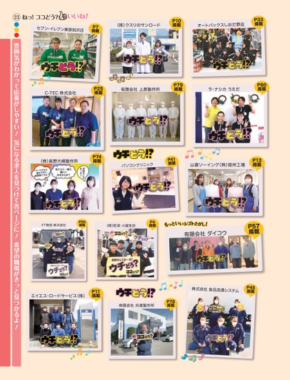 ねっ!ココどう?セブン-イレブン東部加沢店P7掲載(株)クスリのサンロードP10掲載オートバックスしおだ野店P33掲載C-TEC株式会社P25掲載有限会社上原製作所P79掲載ラ・ナシカうえだP60掲載(株)長野大崎製作所P74掲載パソコンクリニックP41掲載山喜ソーイング(株)信州工場P13掲載FT物流株式会社P50掲載(株)旺栄小諸支店P4掲載有限会社ダイコウP57掲載エイエス・ロードサービス(株)P11掲載有限会社共進製作所P78掲載株式会社食品流通システムP45掲載23●●●雰囲気がわかって応募がしやすい!気になる求人を見つけて各ページに!希望の職場がきっと見つかるよ!