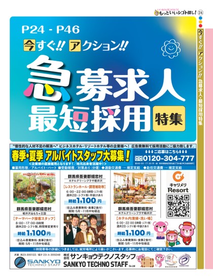 今24●●●すぐ!!クション!!急募求人・最短採用特集P24-P46春季・夏季アルバイトスタッフ大募集<企業様の直接雇用となります!/地元出身者活躍中!>!ご応募はこちら0120-304-777受付9:00〜17:30(月〜金)東京都豊島区東池袋3丁目4番3号【池袋営業所】”慢性的な人材不足の解消へ”ビジネスホテル・リゾートホテル等の企業様へ!広告費無料で採用活動にご協力致します。■雇用形態/アルバイト・パート■受動喫煙/対策あり(分煙)◆通勤交通費→規定支給◆赴任交通費→規定支給群馬県吾妻郡嬬恋村ホテルグリーンプラザ軽井沢【レストランホール・調理補助等】6:00〜22:00(8時間・シフト制)週休2日・シフト制・中抜けあり時給1,100円時(住込み寮費無料・食事2食付)期間:5月〜11月中旬頃群馬県吾妻郡嬬恋村ホテルグリーンプラザ軽井沢群馬県吾妻郡嬬恋村軽井沢おもちゃ王国【テーマパーク接客スタッフ】8:00〜17:00・8時間週休2日・シフト制、時間帯変更有り時給1,100円(住込み寮費無料・食事2食付)期間:5月〜11月中旬頃【ホテル内清掃・洗い場】6:00〜22:00(8時間・シフト制)週休2日・シフト制・中抜けあり時給1,100円(住込み寮費無料・食事2食付)期間:5月〜11月中旬頃※時間帯等の詳細につきましては、就労場所により違いがございます。応募時にお電話にてご確認下さい。派遣派23-300122/紹介23-ユ-300248