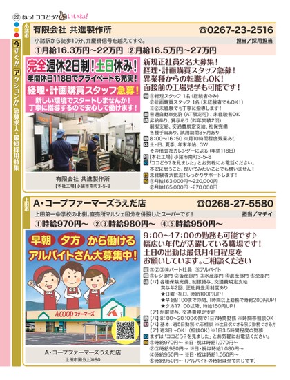 今☎0267-23-2516担当/採用担当小諸駅から徒歩10分、弁慶橋信号を越えてすぐ。①月給16.3万円〜22万円②月給16.5万円〜27万円完全週休2日制!土日休み!年間休日118日でプライベートも充実!経理・計画購買スタッフ急募!新しい環境でスタートしませんか!丁寧に指導するので安心して働けます!有限会社共進製作所【本社工場】小諸市南町3-5-8新規正社員2名大募集!経理・計画購買スタッフ急募!異業種からの転職もOK!面接前の工場見学も可能です!①経理スタッフ1名(経験者のみ)②計画購買スタッフ1名(未経験者でもOK!)※②未経験でも丁寧に指導します!普通自動車免許(AT限定可)、未経験者OK昇給あり、賞与あり(昨年実績2回)制服支給、交通費規定支給、社保完備各種手当あり、試用期間3ヶ月あり8:00〜16:50※月10時間程度残業あり土・日、夏季、年末年始、GWその他会社カレンダーによる(年間118日)[本社工場]小諸市南町3-5-8「ココどう?を見ました」とお気軽にお電話ください。不安に思うこと、聞いてみたいことでも構いません!未経験者大歓迎!しっかりサポートします!①月給163,000円〜220,000円②月給165,000円〜270,000円有限会社共進製作所小諸市ねっ!ココどう?27●●●すぐ!!クション!!急募求人・最短採用特集☎0268-27-5580担当/マチイ上田第一中学校の北側。直売所マルシェ国分を併設したスーパーです!①時給970円〜②③時給980円〜④⑤時給950円〜A・コープファーマーズうえだ店上田市夕方早朝から働けるアルバイトさん大募集中!9:00〜17:00の勤務も可能です♪幅広い年代が活躍している職場です!土日の出勤は最低月4日程度をお願いしています。ご相談ください①②③④パート社員⑤アルバイト①レジ部門②畜産部門③水産部門④農産部門⑤全部門【パ】各種保険完備、制服貸与、交通費規定支給賞与年2回、正社員登用制度あり★日曜・祝日、時給100円UP!★早朝8:00までの間、1時間以上勤務で時給200円UP!★夕方17:00以降、時給150円UP!【ア】制服貸与、交通費規定支給【パ】8:00〜20:00の間で1日7時間勤務※時間帯相談OK!【パ】基本:週5日勤務で応相談※土日祝できる限り勤務できる方【ア】週3日〜OK!(相談OK)※1日3.5時間程度の勤務まずは「ココどう?を見ました」とお気軽にお電話ください。①時給970円〜※日・祝は時給1,070円〜②③時給980円〜※日・祝は時給1,080円〜④時給950円〜※日・祝は時給1,050円〜⑤時給950円〜(アルバイトの時給は全て同じです)A・コープファーマーズうえだ店上田市国分上沖80