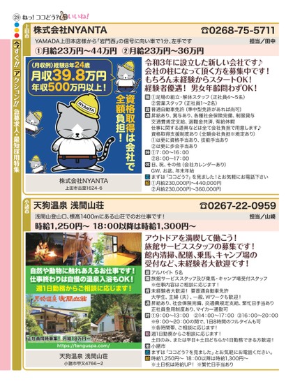 今令和3年に設立した新しい会社です♪会社の柱になって頂く方を募集中です!もちろん未経験からスタートOK!経験者優遇!男女年齡問わずOK!①足場の組立・解体スタッフ(正社員4〜5名)②営業スタッフ(正社員1〜2名)普通自動車免許(準中型免許があれば尚可)昇給あり、賞与あり、各種社会保険完備、制服貸与交通費規定支給、退職金共済、有給休暇仕事に関する道具などは全て会社負担で用意します♪資格取得支援制度あり(全額会社負担※規定あり)①は更に資格手当あり、技能手当あり②は更に歩合手当あり①7:00〜16:00②8:00〜17:00日、祝、その他(会社カレンダーあり)GW、お盆、年末年始まずは「ココどう?」を見ました!とお気軽にお電話下さい①月給230,000円〜440,000円②月給230,000円〜360,000円資格取得は会社で全額負担!(月収例)経験8年24歳月収39.8万円年収500万円以上!株式会社NYANTA上田市古里1624-6YAMADA上田本店様から「岩門西」の信号に向い車で1分、左手です①月給23万円〜44万円②月給23万円〜36万円☎0267-22-0959担当/山崎天狗温泉浅間山荘浅間山登山口、標高1400mにある山荘でのお仕事です!時給1,250円〜18:00以降は時給1,300円〜小諸市自然や動物に触れあえるお仕事です!仕事終わりは自慢の温泉入浴もOK!週1日勤務からご相談に応じます!正社員同時募集!月給18万円〜https://tenguspa.com/天狗温泉浅間山荘小諸市甲又4766-2アウトドアを満喫して働こう!旅館サービススタッフの募集です!館内清掃、配膳、乗馬、キャンプ場の受付など、未経験者大歓迎です!アルバイト5名旅館サービススタッフ及び乗馬・キャンプ場受付スタッフ※仕事内容はご相談に応じます!未経験者大歓迎!要普通自動車免許大学生、主婦(夫)、一般、Wワークも歓迎!昇給あり、社会保険完備、交通費規定支給、繁忙日手当あり正社員登用制度あり、マイカー通勤可①9:00〜13:00②14:00〜17:00③16:00〜20:00※9:00〜20:00の間で、1日8時間のフルタイムも可※各時間帯、ご相談に応じます!週1日勤務からご相談に応じます!土日のみ、または平日+土日どちらか1日勤務できる方歓迎!小諸市まずは「ココどう?を見ました」とお気軽にお電話ください。時給1,250円〜18:00以降は時給1,300円〜※土日祝は時給UP!※繁忙日手当あり☎0268-75-5711担当/田中株式会社NYANTA上田市ねっ!ココどう?29●●●すぐ!!クション!!急募求人・最短採用特集