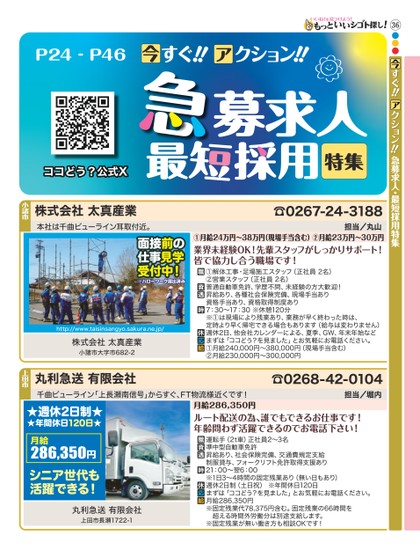 今36●●●すぐ!!クション!!急募求人・最短採用特集☎0267-24-3188担当/丸山①月給24万円〜38万円(現場手当含む)②月給23万円〜30万円業界未経験OK!先輩スタッフがしっかりサポート!皆で協力し合う職場です!①解体工事・足場施工スタッフ(正社員2名)②営業スタッフ(正社員2名)普通自動車免許、学歴不問、未経験の方大歓迎!昇給あり、各種社会保険完備、現場手当あり資格手当あり、資格取得制度あり7:30〜17:30※休憩120分※①は現場により残業あり、業務が早く終わった時は、定時より早く帰宅できる場合もあります(給与は変わりません)週休2日、他会社カレンダーによる、夏季、GW、年末年始などまずは「ココどう?を見ました」とお気軽にお電話ください。①月給240,000円〜380,000円(現場手当含む)②月給230,000円〜300,000円前見面接の仕事学受付中!※ハローワーク届出済みhttp://www.taisinsangyo.sakura.ne.jp/株式会社太真産業小諸市大字市682-2P24-P46ココどう?公式X株式会社太真産業本社は千曲ビューライン耳取付近。小諸市千曲ビューライン「上長瀬南信号」からすぐ、FT物流様近くです!丸利急送有限会社上田市★週休2日制★★年間休日120日★月給286,350円シニア世代も活躍できる!丸利急送有限会社上田市長瀬1722-1☎0268-42-0104担当/堀内月給286,350円ルート配送の為、誰でもできるお仕事です!年齢問わず活躍できるのでお電話下さい!運転手(2t車)正社員2〜3名準中型自動車免許昇給あり、社会保険完備、交通費規定支給制服貸与、フォークリフト免許取得支援あり21:00〜翌6:00※1日3〜4時間の固定残業あり(無い日もあり)週休2日制(土日祝)※年間休日120日まずは「ココどう?を見ました」とお気軽にお電話ください。月給286,350円※固定残業代78,375円含む。固定残業の66時間を超える時間外労働分は別途支給します。※固定残業が無い働き方も相談OKです!