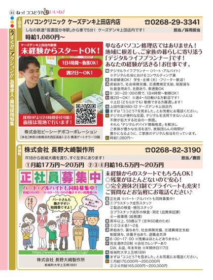 今☎0268-29-3341担当/採用担当しなの鉄道「信濃国分寺駅」から車で5分!ケーズデンキ上田店内です!時給1,080円〜パソコンクリニックケーズデンキ上田店内店上田市ケーズデンキ上田店内勤務未経験からスタートOK!1日4時間〜勤務OK!週2日〜OK!採用HPより24時間受付可能!面接は現地で行います!株式会社ピーシーデポコーポレーション[本社]神奈川県横浜市西区高島1-2-5横濱ゲートタワー19階単なるパソコン修理店ではありません!地域に根差し、ご家族の暮らしに寄り添う「デジタルライフプランナー」です!あなたの経験が活きる!お仕事です。デジタルライフプランナー(パート・アルバイト)※デジタル社会におけるコンサルティング業未経験者OK!学生・主婦(夫)・フリーター歓迎!昇給あり、社会保険完備、交通費規定支給、制服貸与社員登用あり、社割あり、車通勤OK9:30〜20:00の間で、1日4時間〜勤務OK!週2日〜OK!※週4〜5日働ける方歓迎です!※土日(どちらかでも)勤務できる方優遇します!上田市国分80-12ケーズデンキ上田店内まずは「ココどう?を見ました」とお気軽にお電話ください。デジタルが便利な反面、デジタルを活用できない人には不便が拡大する社会の一側面。それら「デジタルデバイド情報格差」を解決しご家族が豊かな生活を送り、家族団らんの時間が豊かになるように、ご家族のデジタル担当を行っています。時給1,080円〜41●●●すぐ!!クション!!急募求人・最短採用特集ねっ!ココどう?☎0268-82-3190担当/鹿田R18から坂城大橋を渡り、すぐ左手にあります!①月給17万円〜20万円②③④月給16.5万円〜20万円株式会社長野大崎製作所坂城町未経験からのスタートでもちろんOK!◎残業がほとんどないので安心!◎完全週休2日制でプライベートも充実!ご質問などお気軽にお電話ください♪正社員※パート・アルバイトも同時募集中!①プラスチック成形スタッフ②製品の検査・梱包スタッフ③プラスチック成形の検査・測定(品質保証課)④一般事務(総務課)高卒以上、59歳以下(定年60歳のため)①②③④各1〜2名昇給あり、賞与あり、社会保険完備、交通費規定支給制服貸与、扶養手当あり、退職金共済8:00〜17:00※残業はほとんどありません!完全週休2日制※会社カレンダーありGW、お盆、年末年始※年間休日117日坂城町大字上五明1891まずは「ココどう?を見ました」とお気軽にお電話ください。①月給170,000円〜200,000円②③④月給165,000円〜200,000円正社員募集中パート・アルバイトも同時募集中!時給980円〜9:00〜15:00の働きやすい時間帯OKパートさんも働きやすい時間帯ですよ!私たちと一緒にみませんか?働いてお待ちしてま〜す!https://www.nagano-oosaki.co.jp/株式会社長野大崎製作所坂城町大字上五明1891