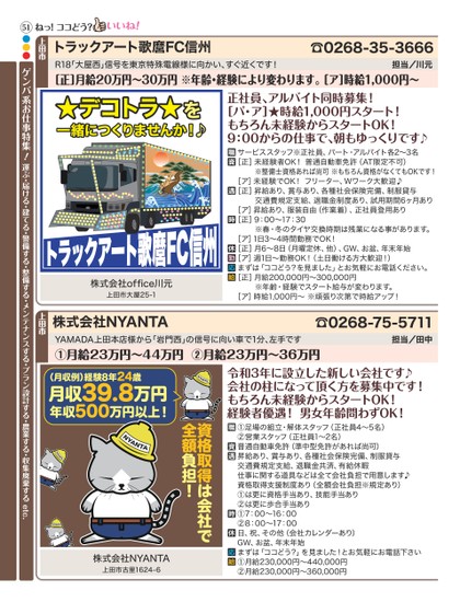 トラックアート歌麿FC信州R18「大屋西」信号を東京特殊電線様に向かい、すぐ近くです!☎0268-35-3666担当/川元[正]月給20万円〜30万円※年齢・経験により変わります。[ア]時給1,000円〜★デコトラ★を一緒につくりませんか!♪正社員、アルバイト同時募集![パ・ア]★時給1,000円スタート!もちろん未経験からスタートOK!9:00からの仕事で、朝もゆっくりです♪サービススタッフ※正社員、パート・アルバイト各2〜3名[正]未経験者OK!普通自動車免許(AT限定不可)※整備士資格あれば尚可※もちろん資格がなくてもOKです![ア]未経験でOK!フリーター、Wワーク大歓迎♪[正]昇給あり、賞与あり、各種社会保険完備、制服貸与交通費規定支給、退職金制度あり、試用期間6ヶ月あり[ア]昇給あり、服装自由(作業着)、正社員登用あり[正]9:00〜17:30※春・冬のタイヤ交換時期は残業になる事があります。[ア]1日3〜4時間勤務でOK![正]月6〜8日(月曜定休、他)、GW、お盆、年末年始[ア]週1日〜勤務OK!(土日働ける方大歓迎!)まずは「ココどう?を見ました」とお気軽にお電話ください。[正]月給200,000円〜300,000円※年齢・経験でスタート給与が変わります。[ア]時給1,000円〜※頑張り次第で時給アップ!株式会社office川元上田市大屋25-1株式会社NYANTAYAMADA上田本店様から「岩門西」の信号に向い車で1分、左手です①月給23万円〜44万円②月給23万円〜36万円☎0268-75-5711担当/田中令和3年に設立した新しい会社です♪会社の柱になって頂く方を募集中です!もちろん未経験からスタートOK!経験者優遇!男女年齡問わずOK!①足場の組立・解体スタッフ(正社員4〜5名)②営業スタッフ(正社員1〜2名)普通自動車免許(準中型免許があれば尚可)昇給あり、賞与あり、各種社会保険完備、制服貸与交通費規定支給、退職金共済、有給休暇仕事に関する道具などは全て会社負担で用意します♪資格取得支援制度あり(全額会社負担※規定あり)①は更に資格手当あり、技能手当あり②は更に歩合手当あり①7:00〜16:00②8:00〜17:00日、祝、その他(会社カレンダーあり)GW、お盆、年末年始まずは「ココどう?」を見ました!とお気軽にお電話下さい①月給230,000円〜440,000円②月給230,000円〜360,000円資格取得は会社で全額負担!(月収例)経験8年24歳月収39.8万円年収500万円以上!株式会社NYANTA上田市古里1624-6ねっ!ココどう?上田市上田市51●●●ゲンバ系お仕事特集!運ぶ・届ける・建てる・警備する・整備する・メンテナンスする・プラン設計する・農業する・収集廃棄するetc.