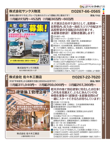 58●●●ゲンバ系お仕事特集!運ぶ・届ける・建てる・警備する・整備する・メンテナンスする・プラン設計する・農業する・収集廃棄するetc.☎0267-66-0565担当/小山駒場公園のすぐそば。グループ企業のカクショウ運輸と同じ敷地です!①月給22万円〜45万円②月給30万円〜60万円株式会社サンクス物流佐久市ドライバー募集!大型中型未経験者歓迎!・経験者優遇!資格取得支援制度ありメール問い合わせは♪QRコードから♪株式会社サンクス物流佐久市猿久保235-1-2F大手運送会社の下請けとして、北関東〜長野県内、佐久市〜南佐久エリアの配送や高原野菜の全国配送のお仕事です。未経験者歓迎!経験者優遇します!正社員2〜4名①中型ドライバー②大型ドライバー大型・中型免許、学歴・経験不問、未経験者歓迎!※フォークリフト免許取得者歓迎!昇給あり、社会保険完備、資格取得支援制度あり車・バイク通勤可、転勤なし、制服貸与、社員登用制度あり運行スケジュールによる月4日〜8日※シフトによる※繁忙期により変動ありお盆、年末年始休暇あり佐久市猿久保235-1(車庫:佐久市鳴瀬)まずは「ココどう?を見ました」とお気軽にお電話ください。平日夜と土日でも電話対応ができます。メールでのお問い合わせもOK!sankusu2017@yahoo.co.jp①月給220,000円〜450,000円②月給300,000円〜600,000円※試用期間3ヶ月あり。月給171,000円〜※経験により優遇!R18「平林信号」から東御市方面に約500m左手です!①月給311,040円〜②月給259,000円〜③月給207,360円〜担当/新井軽井沢建築施工管理急募!現場作業員の方も経験を積んで施工管理を目指していただけます!https://www.k-sasakikomuten.com/株式会社佐々木工務店小諸市田町2-10-9軽井沢の地で別荘建築に特化したお仕事!この先を見据えて、ともに歩んでいける仲間を募集中!経験者・未経験者問わず一緒にスタートできる方お待ちしています!正社員①②③各1名①建築施工管理②建築士③木造建築現場作業員普通自動車免許(③はAT限定不可)①現場管理経験※2級建築士・2級建築施工管理技士あれば尚可②2級建築士以上③40歳以下の方(キャリア形成のため)昇給あり、賞与あり、社会保険完備、交通費規定支給退職金共済あり、退職金制度あり、試用期間3ヶ月間あり8:00〜18:00(実働8時間)土・日・祝日、その他会社カレンダーによるGW、お盆、年末年始※年間休日105日まずは「ココどう?を見ました」とお気軽にお電話ください。①月給311,040円〜483,840円(試用期間中:日給12,000円〜)②月給259,000円〜401,760円③月給207,360円〜259,200円(試用期間中:時給1,150円〜)☎0267-22-7620株式会社佐々木工務店小諸市