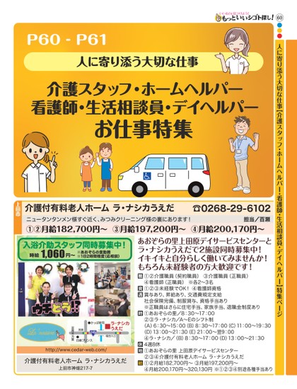 60●●●人に寄り添う大切な仕事【介護スタッフ・ホームヘルパー・看護師・生活相談員・デイヘルパー】特集ページP60-P61人に寄り添う大切な仕事介護スタッフ・ホームヘルパー看護師・生活相談員・デイヘルパーお仕事特集ニュータンタンメン様すぐ近く、みつみクリーニング様の裏にあります!①②月給182,700円〜③月給197,200円〜④月給200,170円〜担当/百瀬☎0268-29-6102介護付有料老人ホームラ・ナシカうえだ上田市入浴介助スタッフ同時募集中!1,060円〜時給※あおぞらの里勤務※1日2時間程度(応相談)http://www.cedar-web.com/介護付有料老人ホームラ・ナシカうえだ上田市神畑217-7あおぞらの里上田原デイサービスセンターとラ・ナシカうえだで2施設同時募集中!イキイキと自分らしく働いてみませんか!もちろん未経験者の方大歓迎です!①②介護職員(契約職員)③介護職員(正職員)④看護師(正職員)※各2〜3名①②③未経験でOK!④看護師資格賞与あり、昇給あり、交通費規定支給社会保険完備、制服貸与、資格手当あり※正職員はさらに住宅手当、家族手当、退職金制度あり①あおぞらの里/8:30〜17:00②③ラ・ナシカ/A〜Eのシフト制(A)6:30〜15:00(B)8:30〜17:00(C)11:00〜19:30(D)13:00〜21:30(E)21:00〜翌9:00④ラ・ナシカ/(B)8:30〜17:00(D)13:00〜21:304週8休①あおぞらの里上田原デイサービスセンター②③④介護付有料老人ホームラ・ナシカうえだ①②月給182,700円〜③月給197,200円〜④月給200,170円〜320,130円※①②③④別途各種手当あり