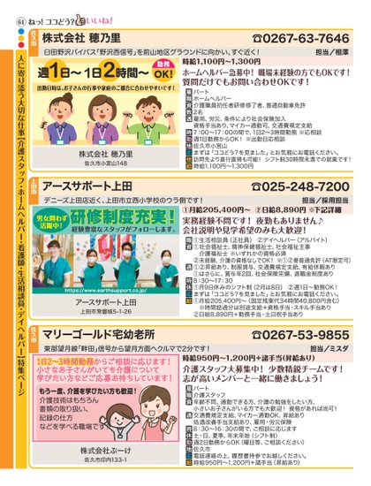 臼田野沢バイパス「野沢西信号」を前山地区グラウンドに向かい、すぐ近く!時給1,100円〜1,300円ホームヘルパー急募中!職場未経験の方でもOKです!質問だけでもお問い合わせOKです!時間〜OK!日〜1日1週2担当/相澤勤務出勤日時は、お子さんの行事や家庭のご都合に合わせやすいです!☎0267-63-7646株式会社穂乃里佐久市●●●61ねっ!ココどう?人に寄り添う大切な仕事【介護スタッフ・ホームヘルパー・看護師・生活相談員・デイヘルパー】特集ページパートホームヘルパー介護職員初任者研修修了者、普通自動車免許2名雇用、労災、条件により社会保険加入資格手当あり、マイカー通勤可、交通費規定支給7:00〜17:00の間で、1日2〜3時間勤務※応相談週1日勤務からOK!※出勤日応相談佐久市小宮山まずは「ココどう?を見ました」とお気軽にお電話ください。訪問先より直行直帰も可能!シフト制30時間未満での就業です!時給1,100円〜1,300円☎025-248-7200担当/採用担当デニーズ上田店近く、上田市立西小学校のウラ側です!男女問わず活躍中!研修制度充実!経験豊富なスタッフがフォローします。①月給205,400円〜②日給8,890円※下記詳細実務経験不問です!夜勤もありません♪会社説明や見学希望のみも大歓迎!①生活相談員(正社員)②デイへルパー(アルバイト)①社会福祉士、精神保健福祉士、社会福祉主事介護福祉士※いずれかの資格必須②未経験、介護の資格なしでOK!※①②要普通免許(AT限定可)①②昇給あり、制服貸与、交通費規定支給、有給休暇あり①はさらに、賞与年2回、社会保険完備、退職金制度あり8:30〜17:30①月9日休みのシフト制(2月は8日)②週1日〜勤務OK!まずは「ココどう?を見ました」とお気軽にお電話ください。①月給205,400円〜(固定残業代34時間40,800円含む)※時間超過分は別途支給+資格手当・スキル手当あり②日給8,890円+勤務手当・土日祝手当ありhttps://www.earthsupport.co.jp/アースサポート上田上田市常磐城5-1-26☎0267-53-9855担当/ミスダ東部望月線「畔田」信号から望月方面へクルマで2分です!マリーゴールド宅幼老所佐久市1日2〜3時間勤務からご相談に応じます!小さなお子さんがいても介護について学びたい方などご応募お待ちしています!もう一度、介護を学びたい方も歓迎!介護技術はもちろん書類の取り扱い、記録の仕方などを学べる職場です!株式会社ぶーけ佐久市印内133-1時給950円〜1,200円+諸手当(昇給あり)介護スタッフ大募集中!少数精鋭チームです!志が高いメンバーと一緒に働きましょう!パート介護スタッフ年齢不問、通勤できる方、介護の勉強をしたい方、小さいお子さんがいる方でも大歓迎!資格があれば尚可!交通費規定支給、マイカー通勤OK、昇給あり処遇改善手当支給あり、雇用・労災保険8:30〜16:30の間で、ご相談に応じます土・日、夏季、年末年始(シフト制)週2日勤務からOK(曜日等、ご相談ください)佐久市電話連絡の上、履歴書持参でお越しください。時給950円〜1,200円+諸手当(昇給あり)株式会社穂乃里佐久市小宮山148アースサポート上田上田市