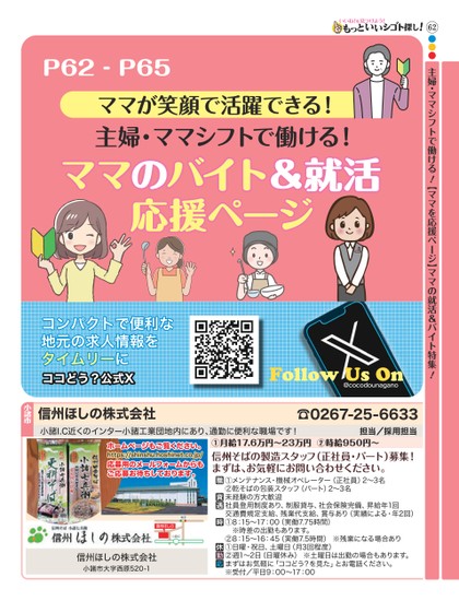 ●●●62主婦・ママシフトで働ける!【ママを応援ページ】ママの就活&バイト特集!P62-P65ママが笑顔で活躍できる!主婦・ママシフトで働ける!ママのバイト&就活応援ページコンパクトで便利な地元の求人情報をタイムリーにココどう?公式X@cocodounagano☎0267-25-6633担当/採用担当ホームページもご覧ください。https://shinshu.hoshinet.co.jp/応募用のメールフォームからもご応募お待ちしております。信州ほしの株式会社小諸市大字西原520-1①月給17.6万円〜23万円②時給950円〜信州そばの製造スタッフ(正社員・パート)募集!まずは、お気軽にお問い合わせください。①メンテナンス・機械オペレーター(正社員)2〜3名②乾そばの包装スタッフ(パート)2〜3名未経験の方大歓迎社員登用制度あり、制服貸与、社会保険完備、昇給年1回交通費規定支給、残業代支給、賞与あり(実績による・年2回)①8:15〜17:00(実働7.75時間)※時差の出勤もあります。②8:15〜16:45(実働7.5時間)※残業になる場合あり①日曜・祝日、土曜日(月3回程度)②週1〜2日(日曜休み)※土曜日は出勤の場合もあります。まずはお気軽に「ココどう?を見た」とお電話ください。※受付/平日9:00〜17:00小諸I.C近くのインター小諸工業団地内にあり、通勤に便利な職場です!信州ほしの株式会社小諸市