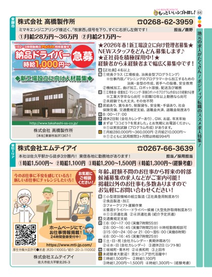 ●●●68地元の求人がたくさん!ポジティブ転職のススメ求人特集!☎0268-62-3959担当/鹿野ミマキエンジニアリング様近く、牧家西」信号を下り、すぐに右折し左側です!①月給28万円〜36万円②月給21万円〜株式会社高橋製作所東御市1日2〜3時間勤務のアルバイト同時募集中!納品ドライバー急募1,000円〜時給◆新工場設立に向け人材募集◆http://www.takahashi-ss-co.jp/株式会社高橋製作所[本社]東御市加沢1367-1★2026年春!新工場設立に向け管理者募集★NEWスタッフをどんどん募集します♪★正社員を積極採用中!★経験者から未経験者まで幅広く募集中です!【正社員】4名以上①班長クラス(工場板金、治具金型プログラミング)※仕事内容/マシニングのプログラマーから加工するための治具・金型の作成、若手への指導、安全教育②機械加工、曲げ加工、ロボット溶接、配送及び雑務①工場板金・旋盤加工・マシニング・溶接ロボットのプログラム作成などの経験が必要※工業大学卒なら尚可※前職10年以上勤務なら尚可②未経験でも大丈夫、その他不問昇給あり、賞与あり、制服貸与、安全靴・手袋あり、社会保険完備、交通費規定支給、退職金共済、退職金制度あり8:00〜17:00週休2日制(会社カレンダーあり)、GW、お盆、年末年始まずは「ココどう?を見ました」とお気軽にお電話ください。※①は実技試験(プログラム作成)があります。①月給280,000円〜360,000円②月給210,000円〜※①②ともに試用期間3ヶ月間は時給994円☎0267-66-3639担当/採用担当本社は佐久平駅から徒歩3分圏内!東信各地に勤務地があります!①時給1,500円〜②時給1,100円③時給1,200〜1,500円④時給1,300円〜(経験考慮)今のお仕事に不安を感じている方!新しいお仕事にチャレンジしたい方!お気軽にご相談ください!年齢、経験不問のお仕事から将来の幹部候補募集の求人などがご案内可能!掲載以外のお仕事も多数ありますのでお気軽にお問い合わせください!ホームページにてお仕事情報掲載!24時間登録受付中!厚生労働大臣許可●派遣:派20-110003/紹介:20-ユ-110002https://www.mti-jp.com/株式会社エムテイアイ佐久市佐久平駅北26-3①小型建設機械の組立製造(正社員登用制度あり)②食品製造・加工③フォークリフト運搬作業④集荷ドライバー・ドライバー候補(大型免許取得制度あり)※①③派遣社員②④派遣社員(紹介予定派遣)交通費規定支給①8:00〜17:00(実働7時間55分)②8:00〜16:45(実働7時間25分)※時短勤務相談可③15:00〜24:00or21:00〜翌6:00(実働8時間)④8:00〜16:45(実働7時間25分)①土・日・祝(会社カレンダー・長期休暇あり)②④水・日(会社カレンダー)③週休2日(シフト制)①坂城町・青木村②④長和町③上田市未経験者大歓迎!男女シニア世代活躍中!①時給1,500円〜②時給1,100円③時給1,200円〜1,500円④時給1,300円〜(経験考慮)株式会社エムテイアイ東信エリア
