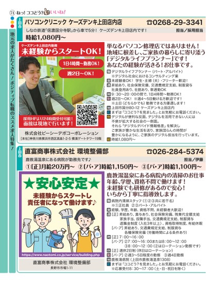 ☎0268-29-3341担当/採用担当しなの鉄道「信濃国分寺駅」から車で5分!ケーズデンキ上田店内です!時給1,080円〜パソコンクリニックケーズデンキ上田店内店上田市●●●ケーズデンキ上田店内勤務未経験からスタートOK!1日4時間〜勤務OK!週2日〜OK!採用HPより24時間受付可能!面接は現地で行います!株式会社ピーシーデポコーポレーション[本社]神奈川県横浜市西区高島1-2-5横濱ゲートタワー19階単なるパソコン修理店ではありません!地域に根差し、ご家族の暮らしに寄り添う「デジタルライフプランナー」です!あなたの経験が活きる!お仕事です。デジタルライフプランナー(パート・アルバイト)※デジタル社会におけるコンサルティング業未経験者OK!学生・主婦(夫)・フリーター歓迎!昇給あり、社会保険完備、交通費規定支給、制服貸与社員登用あり、社割あり、車通勤OK9:30〜20:00の間で、1日4時間〜勤務OK!週2日〜OK!※週4〜5日働ける方歓迎です!※土日(どちらかでも)勤務できる方優遇します!上田市国分80-12ケーズデンキ上田店内まずは「ココどう?を見ました」とお気軽にお電話ください。デジタルが便利な反面、デジタルを活用できない人には不便が拡大する社会の一側面。それら「デジタルデバイド情報格差」を解決しご家族が豊かな生活を送り、家族団らんの時間が豊かになるように、ご家族のデジタル担当を行っています。時給1,080円〜★安心安定★未経験からスタートし責任者になって働けます♪https://www.naotomi.co.jp/service/building.php直富商事株式会社環境整備部長野市市場1-11鹿教湯温泉にある病院内の清掃のお仕事年齢、学歴、資格不問で働けます!未経験でも研修があるので安心!いちから丁寧に指導致します。病院内清掃スタッフ(①②③共に若干名)※①正社員②③パート・アルバイト経験、学歴、年齢、資格不問、未経験者大歓迎![正]昇給あり、賞与あり、社会保険完備、残業代全額支給家族手当、役職手当、交通費規定支給、制服貸与退職金制度(入社3年以上)、資格取得制度、有給休暇[パ・ア]昇給あり、交通費規定支給、制服貸与各種保険完備(労働時間による条件あり)[正]7:00〜16:00[パ・ア]②7:00〜16:00または8:00〜12:00③8:00〜12:00(②はローテーション勤務です)[正]週休2日制(休日はローテーション)[パ・ア]②週3〜5日程度の勤務③週4日勤務鹿教湯病院(上田市鹿教湯温泉1308)まずは「ココどう?を見ました」とお気軽にお電話ください。※応募受付8:30〜17:00(土・日・祝日を除く)担当/伊藤鹿教湯温泉にある病院が勤務先です♪①[正]月給20万円〜②[パ・ア]時給1,150円〜③[パ・ア]時給1,100円〜☎026-284-5374直富商事株式会社環境整備部上田市!地元の求人がたくさん!ポジティブ転職のススメ求人特集71ねっ!ココどう?