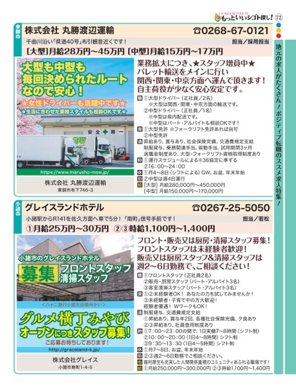 ●●●72地元の求人がたくさん!ポジティブ転職のススメ求人特集!☎0268-67-0121担当/採用担当千曲川沿い「県道40号」布引観音近くです!株式会社丸勝渡辺運輸東御市[大型]月給28万円〜45万円[中型]月給15万円〜17万円大型も中型も毎回決められたルートなので安心!★女性ドライバーも活躍中です★★生活に合わせた業務スタイルも相談OKです★https://www.marusho-msw.jp/株式会社丸勝渡辺運輸東御市布下746-3業務拡大につき、★スタッフ増員中★パレット輸送をメインに行い関西・関東・中京方面へ運んで頂きます!自主荷役が少なく安心安定です。①大型ドライバー(正社員/2名)※大型は関西・関東・中京方面の輸送です。②中型ドライバー(正社員/1名)※中型は県内配送です。※中型はパート・アルバイトも相談OKです!①大型免許※フォークリフト免許あれば尚可②中型免許昇給あり、賞与あり、社会保険完備、交通費規定支給制服貸与、乗務関連手当、皆勤手当、試用期間3ヶ月退職金制度あり、大型・フォークリフト資格取得制度あり①運行スケジュールによる※36協定に準ずる②16:00〜24:00①月4〜8日(シフトによる)GW、お盆、年末年始②中型は週4日運行[大型]月給280,000円〜450,000円[中型]月給150,000円〜170,000円☎0267-25-5050担当/若松小諸駅からR141を佐久方面へ車で5分!「南町」信号手前です!①月給25万円〜30万円②③時給1,100円〜1,400円小諸市のグレイスランドホテル募集フロントスタッフ清掃スタッフ<八十二銀行小諸支店様向かい>グルメ横丁みやびオープンスタッフ募集!につきご応募お待ちしております!http://graceland-k.jp/株式会社グレイス小諸市南町1-4-5フロント・販売又は厨房・清掃スタッフ募集!フロントスタッフは未経験者歓迎!販売又は厨房スタッフ&清掃スタッフは週2〜6日勤務で、ご相談ください!①フロントスタッフ(正社員2名)②販売・厨房スタッフ(パート・アルバイト3名)③客室清掃スタッフ(パート・アルバイト3名)①②未経験者OK!あなたの力を試してみませんか!③未経験者・子育て中の方大歓迎!経験者優遇!WワークもOK!制服貸与、交通費規定支給①昇給あり、賞与年2回、各種社会保険完備、夕食あり②③昇給あり、社員登用制度あり①7:00〜23:00の間で、1日実働7〜8時間(シフト制)②10:00〜20:00(1日4〜8時間)シフト制③9:30〜13:30(1日4〜5時間)シフト制①月7〜8日、お盆、年末年始②③週2〜6日勤務でご相談ください。福利厚生も充実した人間関係重視のコミュニティあふれる職場です!①月給250,000円〜300,000円②③時給1,100円〜1,400円グレイスランドホテル小諸市
