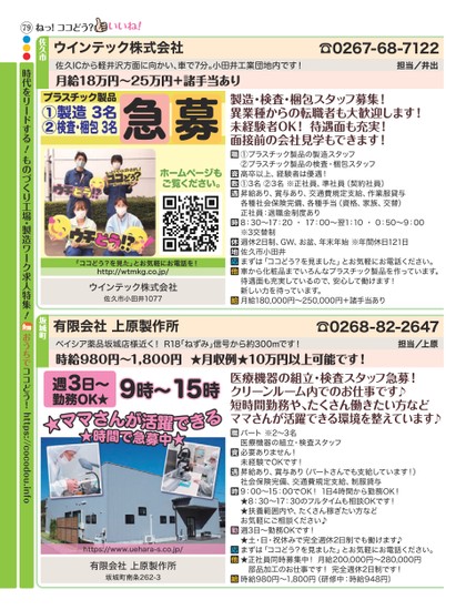 製造・検査・梱包スタッフ募集!異業種からの転職者も大歓迎します!未経験者OK!待遇面も充実!面接前の会社見学もできます!①プラスチック製品の製造スタッフ②プラスチック製品の検査・梱包スタッフ高卒以上、経験者は優遇!①3名②3名※正社員、準社員(契約社員)昇給あり、賞与あり、交通費規定支給、作業服貸与各種社会保険完備、各種手当(資格、家族、交替)正社員:退職金制度あり8:30〜17:20・17:00〜翌1:10・0:50〜9:00※3交替制週休2日制、GW、お盆、年末年始※年間休日121日佐久市小田井まずは「ココどう?を見ました」とお気軽にお電話ください。車から化粧品までいろんなプラスチック製品を作っています。待遇面も充実しているので、安心して働けます!新しい力を待っています。月給180,000円〜250,000円+諸手当あり☎0267-68-7122担当/井出佐久ICから軽井沢方面に向かい、車で7分。小田井工業団地内です!月給18万円〜25万円+諸手当ありウインテック株式会社佐久市ねっ!ココどう?プラスチック製品①製造3名②検査・梱包3名急募ホームページもご覧ください。「ココどう?を見た」とお気軽にお電話を!http://wtmkg.co.jp/ウインテック株式会社佐久市小田井1077☎0268-82-2647担当/上原ベイシア薬品坂城店様近く!R18「ねずみ」信号から約300mです!時給980円〜1,800円★月収例★10万円以上可能です!週3日〜勤務OK★9時〜15時るママさんが活躍でき★時間で急募中★★https://www.uehara-s.co.jp/有限会社上原製作所坂城町南条262-3医療機器の組立・検査スタッフ急募!クリーンルーム内でのお仕事です♪短時間勤務や、たくさん働きたい方などママさんが活躍できる環境を整えています♪パート※2〜3名医療機器の組立・検査スタッフ必要ありません!未経験でOKです!昇給あり、賞与あり(パートさんでも支給しています!)社会保険完備、交通費規定支給、制服貸与9:00〜15:00でOK!1日4時間から勤務OK!★8:30〜17:30のフルタイムも相談OKです!★扶養範囲内や、たくさん稼ぎたい方などお気軽にご相談ください♪週3日〜勤務OKです!★土・日・祝休みで完全週休2日制でも働けます♪まずは「ココどう?を見ました」とお気軽にお電話ください。★正社員同時募集中!月給200,000円〜280,000円部品加工のお仕事です!完全週休2日制です!時給980円〜1,800円(研修中:時給948円)有限会社上原製作所坂城町79●●●時代をリードする!ものづくり工場・製造ワーク求人特集!おうちでココどう!https://cocodou.info