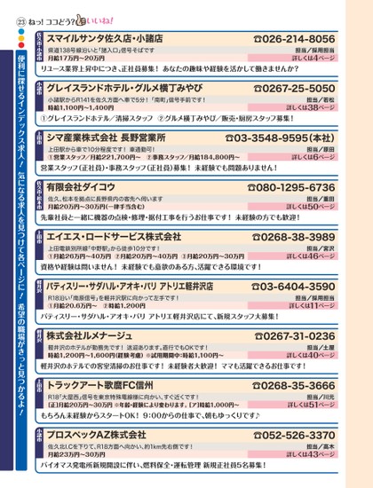 ☎026-214-8056担当/採用担当詳しくは4ページスマイルサンタ佐久店・小諸店県道138号線沿いと「諸入口」信号そばです月給17万円〜20万円佐久市・小諸市ねっ!ココどう?☎0267-25-5050担当/若松詳しくは38ページグレイスランドホテル・グルメ横丁みやび小諸駅からR141を佐久方面へ車で5分!「南町」信号手前です!時給1,100円〜1,400円小諸市①グレイスランドホテル/清掃スタッフ②グルメ横丁みやび/販売・厨房スタッフ募集!リユース業界上昇中につき、正社員募集!あなたの趣味や経験を活かして働きませんか?上田駅から車で10分程度です!車通勤可!①営業スタッフ/月給221,700円〜②事務スタッフ/月給184,800円〜担当/原田詳しくは6ページ☎03-3548-9595(本社)シマ産業株式会社長野営業所上田市☎080-1295-6736担当/重田詳しくは50ページ有限会社ダイコウ佐久、松本を拠点に長野県内の客先へ伺います月給20万円〜30万円(一律手当含む)佐久市・松本市先輩社員と一緒に機器の点検・修理・据付工事を行うお仕事です!未経験の方でも歓迎!☎0268-38-3989担当/宮沢詳しくは46ページエイエス・ロードサービス株式会社上田電鉄別所線「中野駅」から徒歩10分です!①月給26万円〜40万円②月給20万円〜40万円③月給20万円〜30万円上田市資格や経験は問いません!未経験でも意欲のある方、活躍できる環境です!☎03-6404-3590担当/採用担当詳しくは11ページパティスリー・サダハル・アオキ・パリアトリエ軽井沢店R18沿い「南原信号」を軽井沢駅に向かって左手です!①月給20.6万円〜②時給1,200円軽井沢パティスリー・サダハル・アオキ・パリアトリエ軽井沢店にて、新規スタッフ大募集!☎0267-31-0236担当/土屋詳しくは40ページ株式会社ルメナージュ軽井沢のホテルが勤務先です!送迎あります。直行でもOKです!時給1,200円〜1,600円(経験考慮)※試用期間中:時給1,100円〜軽井沢軽井沢のホテルでの客室清掃のお仕事です!未経験者大歓迎!ママも活躍できるお仕事です!営業スタッフ(正社員)・事務スタッフ(正社員)募集!未経験でも問題ありません!☎0268-35-3666担当/川元詳しくは51ページR18「大屋西」信号を東京特殊電線様に向かい、すぐ近くです![正]月給20万円〜30万円※年齢・経験により変わります。[ア]時給1,000円〜トラックアート歌麿FC信州上田市23●●●便利に探せるインデックス求人!気になる求人を見つけて各ページに!希望の職場がきっと見つかるよ☎052-526-3370担当/高木詳しくは43ページプロスペックAZ株式会社佐久北I.Cを下りて、R18方面へ向かい、約1km先右側です!月給23万円〜30万円小諸市バイオマス発電所新規開設に伴い、燃料保全・運転管理新規正社員5名募集!!もちろん未経験からスタートOK!9:00からの仕事で、朝もゆっくりです♪