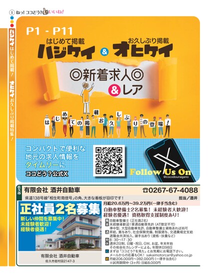 P1-P11はじめて掲載お久しぶり掲載&&レアめじは載ての掲お久しぶりの登場!コンパクトで便利な地元の求人情報をタイムリーにココどう?公式X@cocodounaganoはじめて掲載!お久しぶり掲載特集!佐久市ねっ!ココどう?1●●●有限会社酒井自動車県道138号線「相生町南信号」の角、大きな看板が目印です!正社員2名募集新しい仲間を募集中!未経験者歓迎!経験者優遇!☎0267-67-4088担当/酒井月給20.6万円〜39.2万円(一律手当含む)自動車整備士2名募集!未経験者大歓迎!経験者優遇!資格取得支援制度あり!自動車整備士(正社員2名)未経験者歓迎!普通自動車免許(AT限定不可)準中型、大型自動車免許、自動車整備士資格あれば尚可昇給、賞与あり、社会保険完備、制服貸与、交通費規定支給退職金共済加入、諸手当あり(資格・扶養など)8:30〜17:30週休2日制、日曜・祝日、GW、お盆、年末年始その他会社カレンダーによる。年間休日98日まずは「ココどう?を見た」とお気軽にお電話下さい。メールからの応募もOK!sakaimotorcar@yahoo.co.jp月給206,000円〜392,000円(一律手当含む)※試用期間中(3ヶ月)日給8,000円有限会社酒井自動車佐久市岩村田2147-3