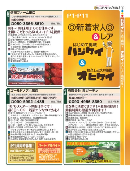 2●●●はじめて掲載!お久しぶり掲載特集!P1-P11&はじめて掲載レア&お久しぶり掲載しなの鉄道滋野駅から徒歩10分!マイカー通勤もOK!時給950円☎080-3366-8610担当/田口9月〜10月末頃までのお仕事です。土耕にこだわったおいしいイチゴを提供!信州ファーム田口東御市苗管理、ハウスの片付け、植え付けスタッフ(他仕事あります)※パート・アルバイト(3名)学歴・経験問いません、未経験者大歓迎!マイカー通勤OK、交通費規定支給、労災保険7:00〜12:00※朝のスタート時間相談OK!※出勤時間、勤務日数ご相談ください!9月〜10月末頃まで※仕事の状況で変動あり、週3日〜勤務OK!「ココどう?を見ました」と、お気軽にお電話ください。豊かな土壌と豊富な水でおいしいイチゴを育てましょう!信州ファーム田口東御市滋野乙147-2週3日〜勤務OK!https://www.shinshu-farm.jp/西友小諸小原店内(JR小海線東小諸駅から徒歩8分)時給980円(試用期間3ヶ月:時給960円)☎090-5992-448510:00スタートのお仕事です!週3日〜OK!残業ナシなので安心!担当/落合新望月トンネルからクルマで15分!意外と早いですよ!時給1,050円〜☎090-4956-8350担当/佐藤男女共に活躍できます!未経験者歓迎!勤務時間も融通が利きます!有限会社泉ガーデン佐久市ゴールドノア小諸店小諸市受付・事務スタッフ(パート・アルバイト)※持込された商品をマニュアルに沿って買い取る業務です!昇給あり、雇用保険あり、交通費規定支給①10:00〜18:00(実働7時間)②10:00〜17:00(実働6時間)日曜・その他(シフト制)、GW、お盆、年末年始等週3〜5日勤務※平日のみOK!(応相談)☆子どもの学校行事や予定など柔軟に対応します☆まずはお気軽にお電話ください。受付10:00〜17:00時給980円(試用期間3ヶ月:時給960円)貴金属買取専門店ゴールドノア小諸店小諸市大字甲字東原田1649-6西友小諸小原店内ゴルフ場のコース管理(機械を使用しての芝刈り等)普通自動車免許、未経験の方大歓迎交通費支給、制服貸与契約社員/6:30〜18:00アルバイト・パート/6:30〜10:30・14:00〜18:00※アルバイト・パートは1日2時間からOK!ご相談ください。週2日勤務から応相談※期間:3月からゴルフ場クローズまで。望月リソルゴルフ場内(旧望月東急ゴルフ)業務上外出が多いため、お気軽に携帯までお電話ください。※固定電話は0267-53-2038有限会社泉ガーデン佐久市協和3596-167正社員同時募集!18万円〜30万円月給エリアマネージャーとして★地域のエリアマネージャー業務★パート社員の教育・指導などパート・アルバイト初めての方でも安心して働けます!マニュアルに沿って買い取りするので未経験でも安心です!貴金属買取専門店古物商番号第481101700035号契約社員積極採用中!月収例176,000円〜(交通費別途)蓼科東急ゴルフコースも同時募集中!