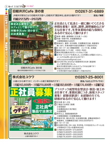 ☎0267-31-6889担当/原旧軽井沢Cafe涼の音軽井沢ねっ!ココどう?5●●●正社員として私達と一緒に働いてくださる仲間を募集!接客、調理、調理補助などが主な仕事です。冬季休業時の給与保障もあるので安心して働けます!接客・調理・調理補助(正社員1〜2名)年齢・学歴不問、未経験者歓迎!※調理経験あれば尚可昇給あり、雇用・労災保険、交通費規定支給、制服貸与賄いあり、冬季休業中の給与保障あり(月給の60%)8:00〜17:30(実働8時間)※シフト制、応相談週休2日制(シフト制)※休日:月8日軽井沢町旧軽井沢972ハウスNo.1138まずは「ココどう?を見ました」とお気軽にお電話ください。メールでのお問い合わせもOKです!cafe.suzunone@gmail.com2013年7月に文化庁より登録有形文化財(建造物)として認可を受けました。軽井沢の歴史を感じられるカフェでのお仕事です!月給220,000円〜260,000円※冬季休業中の給与保障あり(月給の60%)歴史ある建物をカフェとして蘇らせた旧軽井沢cafe涼の音で正社員募集!https://suzunone.main.jp/旧軽井沢Cafe涼の音軽井沢町旧軽井沢972ハウスNo.1138はじめて掲載!お久しぶり掲載特集!JR軽井沢駅北口より旧軽井沢方面へ。旧軽井沢「諏訪神社」徒歩5分圏内です!月給22万円〜26万円担当/山之上(ヤマノウエ)小諸I.Cから車で1分!インター小諸工場団地内です!①月給163,600円〜②月給210,800円〜③月給182,600円〜④月給174,400円〜※詳細下記プラスチック成型用金型設計・製造・加工のお仕事です。業務好調につき、新規スタッフ募集!経験者歓迎!未経験の方でも研修があるので安心して働けます!正社員募集☎0267-25-8001株式会社ユウワ小諸市<急募>①正社員製品寸法測定正社員各1〜2名①製品寸法測定(急募)②金型設計③金属部品加工及び組立④品質管理高卒以上、普通自動車免許※経験者優遇※未経験者歓迎昇給年1回、賞与年2回、社会保険完備、退職金制度あり制服貸与、交通費規定支給(月50,000円まで)8:10〜17:00完全週休2日制、GW、お盆、年末年始、その他会社カレンダーによる※年間休日117日+計画年休日4日①月給163,600円〜210,800円②月給210,800円〜300,000円③月給182,600円〜300,000円④月給174,400円〜300,000円応募/まずはお気軽にお電話ください。http://www.yuwa-net.co.jp/株式会社ユウワ小諸市西原700-1