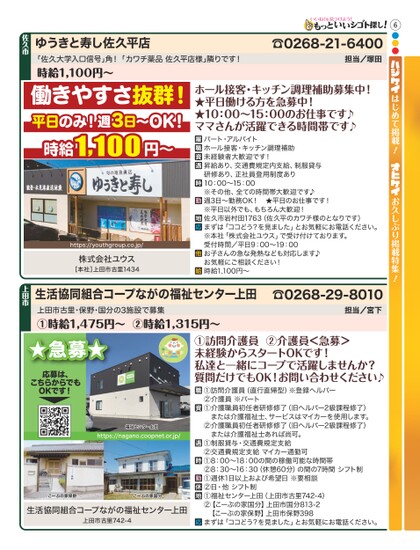6●●●はじめて掲載!お久しぶり掲載特集!☎0268-21-6400担当/塚田ホール接客・キッチン調理補助募集中!★平日働ける方を急募中!★10:00〜15:00のお仕事です♪ママさんが活躍できる時間帯です♪パート・アルバイトホール接客・キッチン調理補助未経験者大歓迎です!昇給あり、交通費規定内支給、制服貸与研修あり、正社員登用制度あり10:00〜15:00※その他、全ての時間帯大歓迎です♪週3日〜勤務OK!★平日のお仕事です!※平日以外でも、もちろん大歓迎!佐久市岩村田1763(佐久平のカワチ様のとなりです)まずは「ココどう?を見ました」とお気軽にお電話ください。※本社「株式会社ユウス」で受け付けております。受付時間/平日9:00〜19:00お子さんの急な発熱なども対応します♪お気軽にご相談ください!時給1,100円〜「佐久大学入口信号」角!「カワチ薬品佐久平店様」隣りです!時給1,100円〜ゆうきと寿し佐久平店佐久市働きやすさ抜群!平日のみ!週3日〜OK!時給円〜1,100☎0268-29-8010担当/宮下生活協同組合コープながの福祉センター上田上田市古里・保野・国分の3施設で募集①時給1,475円〜②時給1,315円〜上田市★急募★★急応募は、こちらからでもOKです!福祉センター上田https://nagano.coopnet.or.jp/こーぷの家保野こーぷの家国分生活協同組合コープながの福祉センター上田上田市古里742-4①訪問介護員②介護員<急募>未経験からスタートOKです!私達と一緒にコープで活躍しませんか?質問だけでもOK!お問い合わせください♪①訪問介護員(直行直帰型)※登録ヘルパー②介護員※パート①介護職員初任者研修修了(旧ヘルパー2級課程修了)または介護福祉士、サービスはマイカーを使用します。②介護職員初任者研修修了(旧ヘルパー2級課程修了)または介護福祉士あれば尚可。①制服貸与・交通費規定支給②交通費規定支給マイカー通勤可①8:00〜18:00の間の稼働可能な時間帯②8:30〜16:30(休憩60分)の間の7時間シフト制①週休1日以上および希望日※要相談②日・他シフト制①福祉センター上田(上田市古里742-4)②【こーぷの家国分】上田市国分813-2【こーぷの家保野】上田市保野398まずは「ココどう?を見ました」とお気軽にお電話ください。https://youthgroup.co.jp/株式会社ユウス[本社]上田市古里1434
