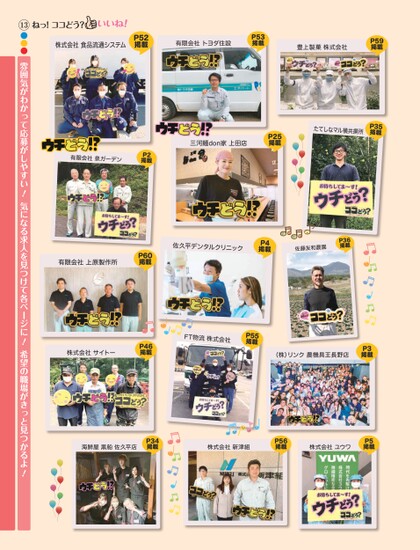 ねっ!ココどう?株式会社食品流通システムP52掲載有限会社トヨダ住設P53掲載豊上製菓株式会社P59掲載三河麺don家上田店P25掲載たてしなマル横共所P35掲載有限会社泉ガーデンP2掲載有限会社上原製作所P60掲載佐久平デンタルクリニックP4掲載佐藤友和農園P36掲載株式会社サイトーP46掲載FT物流株式会社P55掲載(株)リンク農機具王長野店P3掲載海鮮屋黒船佐久平店P34掲載株式会社新津組P56掲載株式会社ユウワP5掲載13●●●雰囲気がわかって応募がしやすい!気になる求人を見つけて各ページに!希望の職場がきっと見つかるよ!