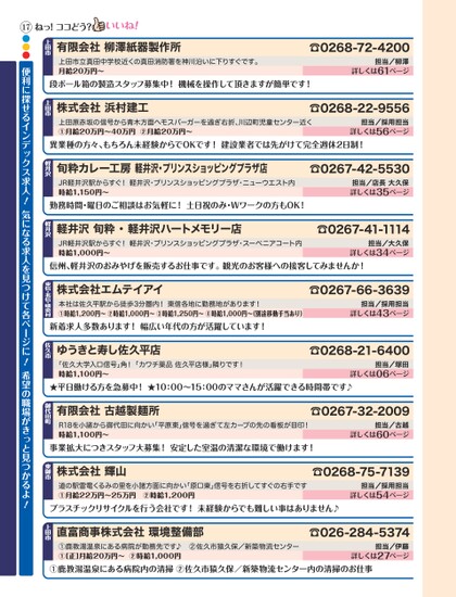 ☎0268-72-4200担当/柳澤詳しくは61ページ有限会社柳澤紙器製作所上田市立真田中学校近くの真田消防署を神川沿いに下りすぐです。月給20万円〜上田市段ボール箱の製造スタッフ募集中!機械を操作して頂きますが簡単です!ねっ!ココどう?☎0268-22-9556担当/採用担当詳しくは56ページ上田原赤坂の信号から青木方面へモスバーガーを過ぎ右折、川辺町児童センター近く①月給20万円〜40万円②月給20万円〜株式会社浜村建工上田市☎0267-42-5530担当/店長大久保詳しくは35ページ旬粋カレー工房軽井沢・プリンスショッピングプラザ店JR軽井沢駅からすぐ!軽井沢・プリンスショッピングプラザ・ニューウエスト内時給1,150円〜軽井沢勤務時間・曜日のご相談はお気軽に!土日祝のみ・Wワークの方もOK!☎0267-41-1114担当/大久保詳しくは34ページ軽井沢旬粋・軽井沢ハートメモリー店JR軽井沢駅からすぐ!軽井沢・プリンスショッピングプラザ・スーベニアコート内時給1,000円〜軽井沢信州、軽井沢のおみやげを販売するお仕事です。観光のお客様への接客してみませんか!異業種の方々、もちろん未経験からでOKです!建設業者では先がけて完全週休2日制!☎0267-66-3639担当/採用担当詳しくは43ページ☎0268-21-6400担当/塚田詳しくは06ページ株式会社エムテイアイ本社は佐久平駅から徒歩3分圏内!東信各地に勤務地があります!①時給1,200円〜②時給1,000円〜③時給1,250円〜④時給1,000円〜(別途移動手当あり)東信・北信・嬬恋村新着求人多数あります!幅広い年代の方が活躍しています!「佐久大学入口信号」角!「カワチ薬品佐久平店様」隣りです!時給1,100円〜ゆうきと寿し佐久平店佐久市☎0267-32-2009担当/古越詳しくは60ページ有限会社古越製麺所R18を小諸から御代田に向かい「平原東」信号を過ぎて左カーブの先の看板が目印!時給1,100円〜御代田町事業拡大につきスタッフ大募集!安定した室温の清潔な環境で働けます!☎0268-75-7139担当/採用担当詳しくは54ページ株式会社輝山道の駅雷電くるみの里を小諸方面に向かい「原口東」信号を右折してすぐの右手です①月給22万円〜25万円②時給1,200円東御市★平日働ける方を急募中!★10:00〜15:00のママさんが活躍できる時間帯です♪17●●●便利に探せるインデックス求人!気になる求人を見つけて各ページに!希望の職場がきっと見つかるよ☎026-284-5374担当/伊藤詳しくは27ページ直富商事株式会社環境整備部①鹿教湯温泉にある病院が勤務先です♪②佐久市猿久保/新築物流センター①[正]月給20万円〜②時給1,000円上田市①鹿教湯温泉にある病院内の清掃②佐久市猿久保/新築物流センター内の清掃のお仕事!プラスチックリサイクルを行う会社です!未経験からでも難しい事はありません♪