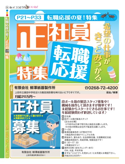 ねっ!ココどう?P21〜P33転職応援の夏!特集★未経験でも楽しく働けます★★残業ほぼナシ★正社員募集有限会社柳澤紙器製作所上田市真田町長6258-1段ボール箱の製造スタッフ募集中!機械を操作して頂きますが簡単です!未経験からスタートできるお仕事です!年齢経験問わず歓迎しています♪正社員段ボール箱の製造スタッフ【主なお仕事】※午前中は2t車で取引先に納品をお願いします。その他の時間は会社内で製造をお願いします。1〜2名普通自動車免許(AT限定不可)※納品用の2t車がマニュアルの為昇給あり、賞与あり、社会保険完備、交通費規定支給退職金制度あり、有給休暇、制服自由です!8:30〜17:30※残業ほぼナシ!週休2日制(会社カレンダーあり)GW、お盆、年末年始まずは「ココどう?」を見ました!とお気軽にお電話下さい。月給200,000円〜希望の仕事がきっとみつかる☎0268-72-4200担当/柳澤有限会社柳澤紙器製作所上田市立真田中学校近くの真田消防署を神川沿いに下りすぐです。月給20万円〜21●●●転職応援の夏!正社員転職応援特集上田市希望の仕事がきっとみつかる