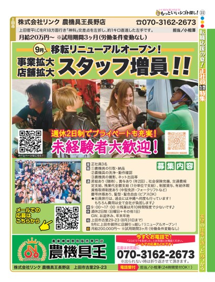 22●●●転職応援の夏!正社員転職応援特集☎070-3162-2673担当/小相澤上田菅平I.CをR18方面行き「神科」交差点を左折し、約1キロ直進した左手です。月給20万円〜※試用期間3ヶ月(労働条件変動なし)株式会社リンク農機具王長野店上田市9月事業拡大店舗拡大移転リニューアルオープン!スタッフ増員!!希望の仕事がきっとみつかる週休2日制でプライベートも充実!未経験者大歓迎!ホームページはこちら!募集内容正社員3名①農機具の引取・納品②農機具の洗浄・動作確認③農機具の撮影、ネット出品等昇給あり(随時)、賞与あり(年2回)、社会保険完備、交通費規定支給、残業代全額支給(1分単位で支給)、制服貸与、有給休暇資格取得制度あり(中型免許・フォークリフトなど)慶弔休暇あり、髪型・髪色自由(ピアスOK)★社員旅行は、過去には沖縄へ何度も行っています!もちろん費用は全て会社が負担します♪9:00〜17:00※残業は月10時間程度で少ないです♪週休2日制(日曜日+その他1日)GW、お盆休み、年末年始上田市古里29-23(8月31日まで)9月に上田市御所に店舗引っ越し!リニューアルオープン!月給200,000円〜※試用期間3ヶ月(労働条件変動なし)メールでの応募はこちらから株式会社リンク農機具王長野店上田市古里29-23今すぐお電話で!「ココどう?を見ました」とお気軽にお電話ください。メールでの応募もOKです!応募はお気軽に070-3162-2673※出られない時は折り返させて頂きます。電話受付担当/小相澤(24時間受付OK!)