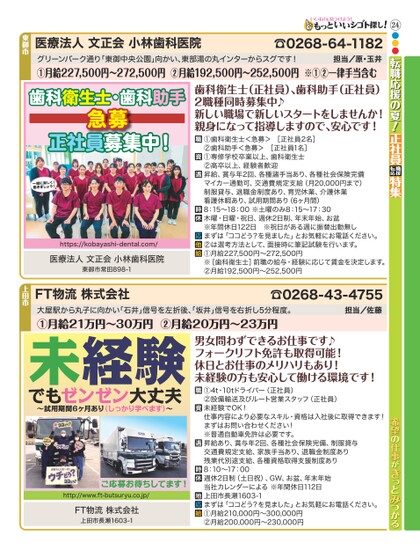 24●●●転職応援の夏!正社員転職応援特集グリーンパーク通り「東御中央公園」向かい、東部湯の丸インターからスグです!①月給227,500円〜272,500円②月給192,500円〜252,500円※①②一律手当含む担当/原・玉井☎0268-64-1182医療法人文正会小林歯科医院東御市歯科衛生士・歯科助手急募正社員募集中!一緒に楽しく!働きましょう!https://kobayashi-dental.com/医療法人文正会小林歯科医院東御市常田898-1歯科衛生士(正社員)、歯科助手(正社員)2職種同時募集中♪新しい職場で新しいスタートをしませんか!親身になって指導しますので、安心です!①歯科衛生士<急募>[正社員2名]②歯科助手<急募>[正社員1名]①専修学校卒業以上、歯科衛生士②高卒以上、経験者歓迎昇給、賞与年2回、各種諸手当あり、各種社会保険完備マイカー通勤可、交通費規定支給(月20,000円まで)制服貸与、退職金制度あり、育児休業、介護休業看護休暇あり、試用期間あり(6ヶ月間)8:15〜18:00※土曜のみ8:15〜17:30木曜・日曜・祝日、週休2日制、年末年始、お盆※年間休日122日※祝日がある週に振替出勤無しまずは「ココどう?を見ました」とお気軽にお電話ください。②は選考方法として、面接時に筆記試験を行います。①月給227,500円〜272,500円※[歯科衛生士]前職の給与・経験に応じて賃金を決定します。②月給192,500円〜252,500円☎0268-43-4755担当/佐藤大屋駅から丸子に向かい「石井」信号を左折後、坂井」信号を右折し5分程度。①月給21万円〜30万円②月給20万円〜23万円FT物流株式会社上田市希望の仕事がきっとみつかる①4t・10tドライバー(正社員)②設備輸送及びルート営業スタッフ(正社員)未経験でOK!仕事内容により必要なスキル・資格は入社後に取得できます!まずはお問い合わせください!※普通自動車免許は必要です。昇給あり、賞与年2回、各種社会保険完備、制服貸与交通費規定支給、家族手当あり、退職金制度あり残業代別途支給、各種資格取得支援制度あり8:10〜17:00週休2日制(土日祝)、GW、お盆、年末年始当社カレンダーによる※年間休日112日上田市長瀬1603-1まずは「ココどう?を見ました」とお気軽にお電話ください。①月給210,000円〜300,000円②月給200,000円〜230,000円男女問わずできるお仕事です♪フォークリフト免許も取得可能!休日とお仕事のメリハリもあり!未経験の方も安心して働ける環境です!未経験でもゼンゼン大丈夫〜試用期間6ヶ月あり(しっかり学べます)〜ご応募お待ちしてます!http://www.ft-butsuryu.co.jp/FT物流株式会社上田市長瀬1603-1