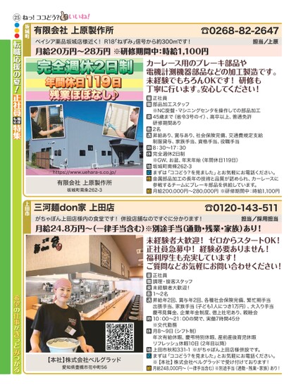 ☎0268-82-2647担当/上原カーレース用のブレーキ部品や電機計測機器部品などの加工製造です。未経験でもちろんOKです!研修も丁寧に行います。安心してください!正社員部品加工スタッフ※NC旋盤・マシニングセンタを操作しての部品加工45歳まで(省令3号のイ)、高卒以上、普通免許研修期間あり2名昇給あり、賞与あり、社会保険完備、交通費規定支給制服貸与、家族手当、資格手当、役職手当8:30〜17:30完全週休2日制※GW、お盆、年末年始(年間休日119日)坂城町南條262-3まずは「ココどう?を見ました」とお気軽にお電話ください。金属部品加工の長年の技術と品質が認められ、カーレースに参戦するチームにブレーキ部品を供給しています。月給200,000円〜280,000円※研修期間中:時給1,100円https://www.uehara-s.co.jp/有限会社上原製作所坂城町南条262-3三河麺don家上田店☎0120-143-511がちゃぽん上田店様内の食堂です!併設店舗なのですぐに分かります!月給24.8万円〜(一律手当含む)※別途手当(通勤・残業・家族)あり!担当/採用担当未経験者大歓迎!ゼロからスタートOK!正社員急募中!経験必要ありません!福利厚生も充実しています!ご質問などお気軽にお問い合わせください!正社員調理・接客スタッフ未経験者大歓迎!1〜2名昇給年2回、賞与年2回、各種社会保険完備、繁忙期手当出張手当、家族手当(子ども1人につき1万円)、大入り手当慶弔見舞金、企業年金制度、借上社宅あり、親睦会10:00〜21:00の間で、実働7時間45分※交代勤務月8〜9日(シフト制)年次有給休暇、慶弔特別休暇、産前産後育児休暇リフレッシュ休暇10日(2年目以降)上田市秋和331-1※がちゃぽん上田店様併設です。まずは「ココどう?を見ました」とお気軽にお電話ください。※【本社】株式会社ベルグラッドで受け付けております!月給248,000円〜(一律手当含む)※別途手当(通勤・残業・家族)あり!【本社】株式会社ベルグラッド愛知県豊橋市花中町56ベイシア薬品坂城店様近く!R18「ねずみ」信号から約300mです!月給20万円〜28万円※研修期間中:時給1,100円有限会社上原製作所坂城町ねっ!ココどう?25●●●転職応援の夏!正社員転職応援特集上田市希望の仕事がきっとみつかる