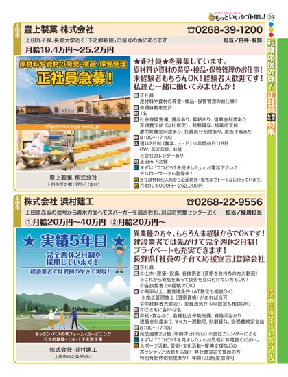 26●●●転職応援の夏!正社員転職応援特集http://www.hojo-seika.jp/豊上製菓株式会社上田市下之郷1525-1(本社)正社員原材料や資材の荷受・検品・保管管理のお仕事!普通自動車免許1名社会保険完備、賞与あり、昇給あり、退職金制度あり交通費支給(当社規定)、制服貸与、残業代支給慶弔見舞金制度あり、社員旅行制度あり、家族手当あり8:00〜17:00週休2日制(基本、土・日)※年間休日118日GW、年末年始、お盆※会社カレンダーあり上田市下之郷まずは「ココどう?を見ました」とお電話下さい♪※ハローワークも登録中!当社は材料仕入れから企画開発・販売までトータルに行っています。月給194,000円〜252,000円☎0268-39-1200担当/白井・服部豊上製菓株式会社上田丸子線、長野大学近く「下之郷新田」の信号の角にあります!月給19.4万円〜25.2万円上田市原材料や資材の荷受・検品・保管管理正社員急募!★正社員★を募集しています。原材料や資材の荷受・検品・保管管理のお仕事!未経験者もちろんOK!経験者大歓迎です!私達と一緒に働いてみませんか!☎0268-22-9556担当/採用担当希望の仕事がきっとみつかる正社員①土木・建築・設備、各技術者(資格をお持ちの方大歓迎)※これから資格を取って技術を身に付けたい方もOK!②各技能者(未経験でOK)①高卒以上、要普通免許(AT限定も相談OK)※施工管理技士(国家資格)があれば尚可②未経験者大歓迎!、要普通免許(AT限定も相談OK)①②ともに各1〜2名昇給・賞与あり、各種社会保険完備、資格手当あり退職金制度あり、マイカー通勤可、制服貸与、交通費規定支給8:00〜17:00完全週休2日制(年間休日118日)※会社カレンダーによるまずは「ココどう?を見ました」とお気軽にお電話ください。スポーツ活動、芸術・文化活動・復興支援などのボランティア活動を応援!弊社書式にて提出の方特別有給休暇制度あり!年間12日程度取得可異業種の方々、もちろん未経験からでOKです!建設業者では先がけて完全週休2日制!プライベートも充実できます!長野県「社員の子育て応援宣言」登録会社★実績5年目★完全週休2日制を採用しています!建設業者では異例の早さで実現!キッチン・バスのリフォーム・ガーデニング公共の建築・土木・上下水道工事株式会社浜村建工上田市中之条358-1上田原赤坂の信号から青木方面へモスバーガーを過ぎ右折、川辺町児童センター近く①月給20万円〜40万円②月給20万円〜株式会社浜村建工上田市