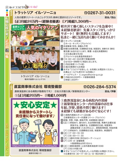 ☎0267-31-0031担当/田山トラットリアイル・ソーニョ軽井沢ねっ!ココどう?27●●●転職応援の夏!正社員転職応援特集人気の星野リゾート・ハルニレテラス内森林に囲まれたリゾートです。[正]月給24万円〜(経験者優遇)[ア]時給1,300円〜星野エリア人気のイタリアンハルニレテラスhttps://ilsogno-karuizawa.jpトラットリアイル・ソーニョ軽井沢星野ハルニレテラス軽井沢で働く新しいスタッフを急募中!未経験者歓迎!先輩スタッフがしっかりサポート!寮(無料)も完備してます♪私達と一緒に気持ち良く働いてみませんか!①キッチン(正社員)②ホール・キッチン(アルバイト)未経験者性別、国籍も不問各種社会保険完備、交通費規定支給、制服貸与、食事付き(無料)寮完備(お店の近くにあり、寮費・水道光熱費無料)①正社員は賞与年2回②アルバイトは社員登用制度あり①9:00〜22:00の間で実働8時間②は1日3〜8時間でご相談に応じます。①月8日程度(シフト制)②週2日勤務から応相談まずは「ココどう?を見た」と、お気軽にお電話をください。応募はメールでも受付中!お気軽に!メールアドレス→il_sogno@sonia-g.co.jp①月給240,000円〜※経験者優遇②時給1,300円〜☎026-284-5374担当/伊藤鹿教湯温泉にある病院が勤務先です♪②佐久市猿久保/新築物流センター①[正]月給20万円〜②時給1,000円直富商事株式会社環境整備部上田市①鹿教湯温泉にある病院内の清掃②新築物流センター内の清掃のお仕事年齢、学歴、資格不問で働けます!未経験でも研修があるので安心です!①病院内清掃スタッフ(正社員)②新築物流センター内清掃(パート・アルバイト)経験、学歴、年齢、資格不問、未経験者大歓迎![正]①昇給あり、賞与あり、社会保険完備、残業代全額支給家族手当、役職手当、交通費規定支給、制服貸与退職金制度(入社3年以上)、資格取得制度、有給休暇[ア]②昇給あり、交通費規定支給、制服貸与、車通勤可[正]①7:00〜16:00[ア]②8:00〜11:30[正]①週休2日制(休日はローテーション)[ア]②月・水・金曜勤務※勤務開始は9月1日から[正]①鹿教湯病院(上田市鹿教湯温泉1308)[ア]②佐久市猿久保まずは「ココどう?を見ました」とお気軽にお電話ください。※応募受付8:30〜17:00(土・日・祝日を除く)★安心安定★未経験からスタートし責任者になって働けます♪https://www.naotomi.co.jp/service/building.php直富商事株式会社環境整備部長野市市場1-11希望の仕事がきっとみつかる