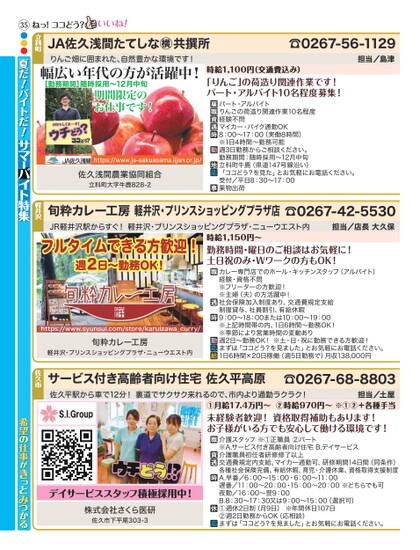 ☎0267-56-1129担当/島津時給1,100円(交通費込み)「りんご」の荷造り関連作業です!パート・アルバイト10名程度募集!パート・アルバイトりんごの荷造り関連作業10名程度経験不問マイカー・バイク通勤OK8:00〜17:00(実働8時間)※1日4時間〜勤務可能週3日勤務からご相談ください。勤務期間:随時採用〜12月中旬立科町牛鹿(県道147号線沿い)「ココどう?を見た」とお気軽にお電話ください。受付/平日8:30〜17:00果物出荷https://www.ja-sakuasama.iijan.or.jp/佐久浅間農業協同組合立科町大字牛鹿828-2JA佐久浅間たてしな○横共所りんご畑に囲まれた、自然豊かな環境です!幅広い年代の方が活躍中!立科町●●●35ねっ!ココどう?[勤務期間]随時採用〜12月中旬期間限定のお仕事です!夏だバイトだ!!☎0267-42-5530担当/店長大久保JR軽井沢駅からすぐ!軽井沢・プリンスショッピングプラザ・ニューウエスト内旬粋カレー工房軽井沢・プリンスショッピングプラザ店軽井沢フルタイムできる方歓迎!週2日〜勤務OK!https://www.syunsui.com/store/karuizawa_curry/旬粋カレー工房軽井沢・プリンスショッピングプラザ・ニューウエスト内時給1,150円〜勤務時間・曜日のご相談はお気軽に!土日祝のみ・Wワークの方もOK!カレー専門店でのホール・キッチンスタッフ(アルバイト)経験・資格不問※フリーターの方歓迎!※主婦(夫)の方活躍中!社会保険加入制度あり、交通費規定支給制服貸与、社員割引、有給休暇9:00〜18:00または10:00〜19:00※上記時間帯の内、1日6時間〜勤務OK!※季節により営業時間の変動あり週2日〜勤務OK!※土・日・祝に勤務できる方歓迎!まずは「ココどう?を見ました」とお気軽にお電話ください。1日6時間×20日稼働(週5日勤務で)月収138,000円サービス付き高齢者向け住宅佐久平高原☎0267-68-8803佐久平駅から車で12分!裏道でサクサク来れるので、市内より通勤ラクラク!担当/土屋①月給17.4万円〜②時給970円〜※①②+各種手当未経験者歓迎!資格取得補助もあります!お子様がいる方でも安心して働ける環境です!デイサービススタッフ積極採用中!株式会社さくら医研佐久市下平尾303-3介護スタッフ※①正職員②パート※A.サービス付き高齢者向け住宅B.デイサービス介護職員初任者研修修了以上交通費規定内支給、マイカー通勤可、研修期間14日間(同条件)各種社会保険完備、有給休暇、育児・介護休業、資格取得支援制度A.早番/6:00〜15:00・6:00〜11:00遅番/11:00〜20:00・15:00〜20:00※どちらでも可夜勤/16:00〜翌9:00B.8:30〜17:30又は9:00〜15:00(選択可)①週休2日制(月9日)※年間休日107日②週2日勤務からOK(応相談)まずは「ココどう?を見ました」とお気軽にお電話ください。佐久市希望の仕事がきっとみつかる