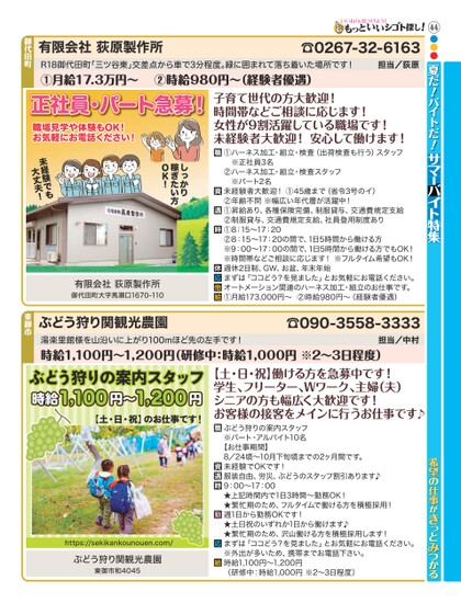44●●●夏だバイトだ!!☎0267-32-6163担当/荻原有限会社荻原製作所御代田町子育て世代の方大歓迎!時間帯などご相談に応じます!女性が9割活躍している職場です!未経験者大歓迎!安心して働けます!①ハーネス加工・組立・検査(出荷検査も行う)スタッフ※正社員3名②ハーネス加工・組立・検査スタッフ※パート2名未経験者大歓迎!①45歳まで(省令3号のイ)②年齢不問※幅広い年代層が活躍中!①昇給あり、各種保険完備、制服貸与、交通費規定支給②制服貸与、交通費規定支給、社員登用制度あり①8:15〜17:20②8:15〜17:20の間で、1日5時間から働ける方※9:00〜17:00の間で、1日5時間から働ける方でもOK!※時間帯などご相談に応じます!※フルタイム希望もOK!週休2日制、GW、お盆、年末年始まずは「ココどう?を見ました」とお気軽にお電話ください。オートメーション関連のハーネス加工・組立のお仕事です。①月給173,000円〜②時給980円〜(経験者優遇)正社員・パート急募!職場見学や体験もOK!お気軽にお電話ください!しっかり稼ぎたい方OK!未経験でも大丈夫!有限会社荻原製作所御代田町大字馬瀬口1670-110R18御代田町「三ツ谷東」交差点から車で3分程度。緑に囲まれて落ち着いた場所です!①月給17.3万円〜②時給980円〜(経験者優遇)希望の仕事がきっとみつかるぶどう狩りの案内スタッフ※パート・アルバイト10名【お仕事期間】8/24頃〜10月下旬頃までの2ヶ月間です。未経験でOKです!服装自由、労災、ぶどうのスタッフ割引あります♪9:00〜17:00★上記時間内で1日3時間〜勤務OK!★繁忙期のため、フルタイムで働ける方を積極採用!週1日から勤務OKです!★土日祝のいずれか1日から働けます♪★繁忙期のため、沢山働ける方を積極採用します!まずは「ココどう?を見ました」とお気軽にお電話ください。※外出が多いため、携帯までお電話下さい。時給1,100円〜1,200円(研修中:時給1,000円※2〜3日程度)【土・日・祝】働ける方を急募中です!学生、フリーター、Wワーク、主婦(夫)シニアの方も幅広く大歓迎です!お客様の接客をメインに行うお仕事です♪ぶどう狩りの案内スタッフ時給1,100円【土・日・祝】のお仕事です!1,200円〜https://sekikankounouen.com/ぶどう狩り関観光農園東御市和4045湯楽里館様を山沿いに上がり100mほど先の左手です!時給1,100円〜1,200円(研修中:時給1,000円※2〜3日程度)担当/中村☎090-3558-3333ぶどう狩り関観光農園東御市